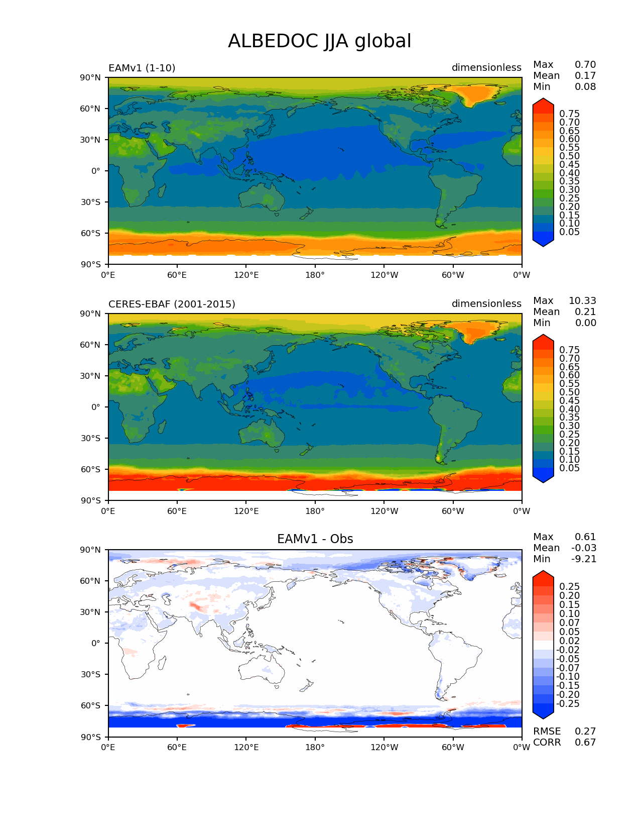 Use this command to recreate this image: | e3sm_diags --no_viewer --short_test_name 'EAMv1' --diff_colormap 'diverging_bwr.rgb' --contour_levels '0.05' '0.1' '0.15' '0.2' '0.25' '0.3' '0.35' '0.4' '0.45' '0.5' '0.55' '0.6' '0.65' '0.7' '0.75' --test_data_path '/global/cscratch1/sd/plma/people/for_bryce/climo/v1_f2000/' --diff_levels '-0.25' '-0.2' '-0.15' '-0.1' '-0.07' '-0.05' '-0.02' '0.02' '0.05' '0.07' '0.1' '0.15' '0.2' '0.25' --backend 'mpl' --canvas_size_h '1628' --reference_colormap 'cet_rainbow.rgb' --reference_data_path '/global/project/projectdirs/acme/acme_diags/obs_for_e3sm_diags/climatology/' --main_title 'ALBEDOC JJA global' --results_dir '/global/cscratch1/sd/beharrop/people/for_polun/EAMv1/' --regions 'global' --test_colormap 'cet_rainbow.rgb' --regrid_method 'conservative' --variables 'ALBEDOC' --figsize '8.5' '11.0' --ref_name 'ceres_ebaf_toa_v4.0' --run_type 'model_vs_obs' --regrid_tool 'esmf' --num_workers '64' --reference_name 'CERES-EBAF' --output_format 'png' --case_id 'CERES-EBAF-TOA-v4.0' --granulate 'variables' 'seasons' 'regions' 'plevs' --test_name 'v1_f2000' --seasons 'JJA' --arrows --selectors 'sets' 'seasons' --diff_title 'EAMv1 - Obs' --sets 'lat_lon' --canvas_size_w '1212' --multiprocessing --dpi '150' |