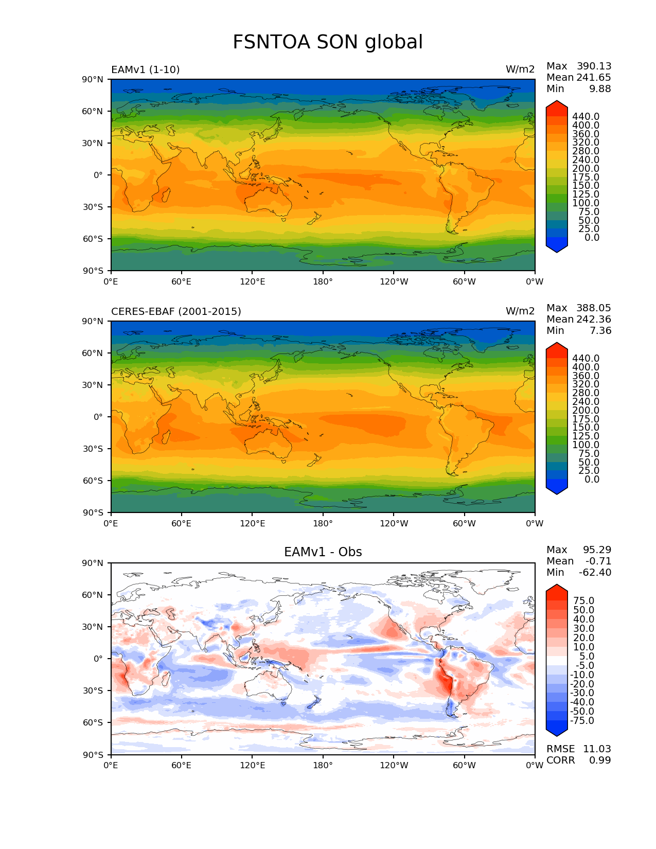 Use this command to recreate this image: | e3sm_diags --no_viewer --short_test_name 'EAMv1' --diff_colormap 'diverging_bwr.rgb' --contour_levels '0' '25' '50' '75' '100' '125' '150' '175' '200' '240' '280' '320' '360' '400' '440' --test_data_path '/global/cscratch1/sd/plma/people/for_bryce/climo/v1_f2000/' --diff_levels '-75' '-50' '-40' '-30' '-20' '-10' '-5' '5' '10' '20' '30' '40' '50' '75' --backend 'mpl' --canvas_size_h '1628' --reference_colormap 'cet_rainbow.rgb' --reference_data_path '/global/project/projectdirs/acme/acme_diags/obs_for_e3sm_diags/climatology/' --main_title 'FSNTOA SON global' --results_dir '/global/cscratch1/sd/beharrop/people/for_polun/EAMv1/' --regions 'global' --test_colormap 'cet_rainbow.rgb' --regrid_method 'conservative' --variables 'FSNTOA' --figsize '8.5' '11.0' --ref_name 'ceres_ebaf_toa_v4.0' --run_type 'model_vs_obs' --regrid_tool 'esmf' --num_workers '64' --reference_name 'CERES-EBAF' --output_format 'png' --case_id 'CERES-EBAF-TOA-v4.0' --granulate 'variables' 'seasons' 'regions' 'plevs' --test_name 'v1_f2000' --seasons 'SON' --arrows --selectors 'sets' 'seasons' --diff_title 'EAMv1 - Obs' --sets 'lat_lon' --canvas_size_w '1212' --multiprocessing --dpi '150' |