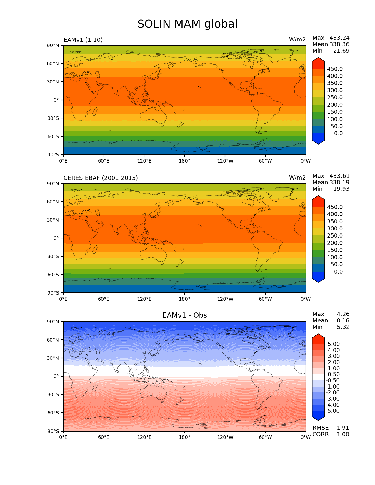 Use this command to recreate this image: | e3sm_diags --no_viewer --short_test_name 'EAMv1' --diff_colormap 'diverging_bwr.rgb' --contour_levels '0' '50' '100' '150' '200' '250' '300' '350' '400' '450' --test_data_path '/global/cscratch1/sd/plma/people/for_bryce/climo/v1_f2000/' --diff_levels '-5' '-4' '-3' '-2' '-1' '-0.5' '0.5' '1' '2' '3' '4' '5' --backend 'mpl' --canvas_size_h '1628' --reference_colormap 'cet_rainbow.rgb' --reference_data_path '/global/project/projectdirs/acme/acme_diags/obs_for_e3sm_diags/climatology/' --main_title 'SOLIN MAM global' --results_dir '/global/cscratch1/sd/beharrop/people/for_polun/EAMv1/' --regions 'global' --test_colormap 'cet_rainbow.rgb' --regrid_method 'conservative' --variables 'SOLIN' --figsize '8.5' '11.0' --ref_name 'ceres_ebaf_toa_v4.0' --run_type 'model_vs_obs' --regrid_tool 'esmf' --num_workers '64' --reference_name 'CERES-EBAF' --output_format 'png' --case_id 'CERES-EBAF-TOA-v4.0' --granulate 'variables' 'seasons' 'regions' 'plevs' --test_name 'v1_f2000' --seasons 'MAM' --arrows --selectors 'sets' 'seasons' --diff_title 'EAMv1 - Obs' --sets 'lat_lon' --canvas_size_w '1212' --multiprocessing --dpi '150' |