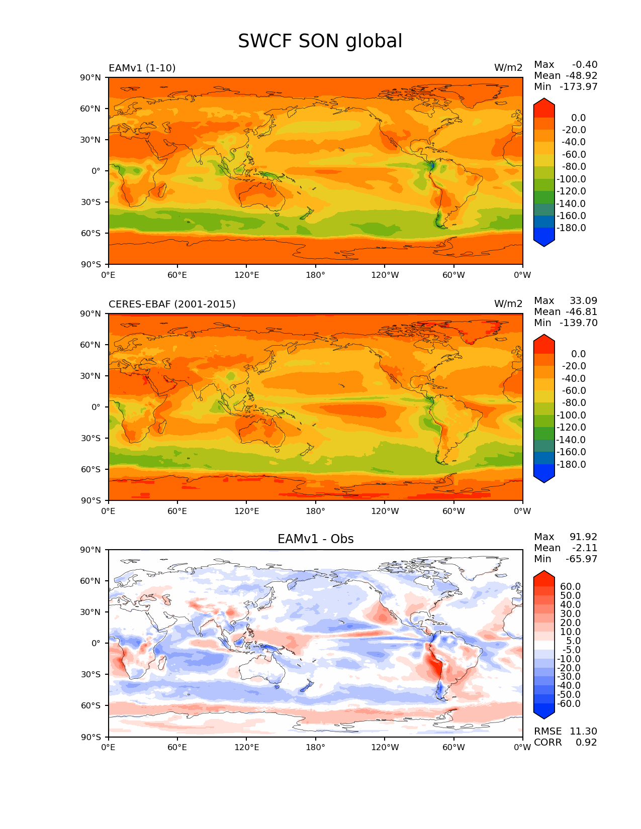 Use this command to recreate this image: | e3sm_diags --no_viewer --variables 'SWCF' --diff_colormap 'diverging_bwr.rgb' --contour_levels '-180' '-160' '-140' '-120' '-100' '-80' '-60' '-40' '-20' '0' --test_data_path '/global/cscratch1/sd/plma/people/for_bryce/climo/v1_f2000/' --diff_levels '-60' '-50' '-40' '-30' '-20' '-10' '-5' '5' '10' '20' '30' '40' '50' '60' --backend 'mpl' --canvas_size_h '1628' --reference_colormap 'cet_rainbow.rgb' --reference_data_path '/global/project/projectdirs/acme/acme_diags/obs_for_e3sm_diags/climatology/' --main_title 'SWCF SON global' --results_dir '/global/cscratch1/sd/beharrop/people/for_polun/EAMv1/' --regions 'global' --test_colormap 'cet_rainbow.rgb' --regrid_method 'conservative' --short_test_name 'EAMv1' --figsize '8.5' '11.0' --ref_name 'ceres_ebaf_toa_v4.0' --run_type 'model_vs_obs' --regrid_tool 'esmf' --num_workers '64' --reference_name 'CERES-EBAF' --output_format 'png' --case_id 'CERES-EBAF-TOA-v4.0' --granulate 'variables' 'seasons' 'regions' 'plevs' --test_name 'v1_f2000' --seasons 'SON' --arrows --selectors 'sets' 'seasons' --diff_title 'EAMv1 - Obs' --sets 'lat_lon' --canvas_size_w '1212' --multiprocessing --dpi '150' |