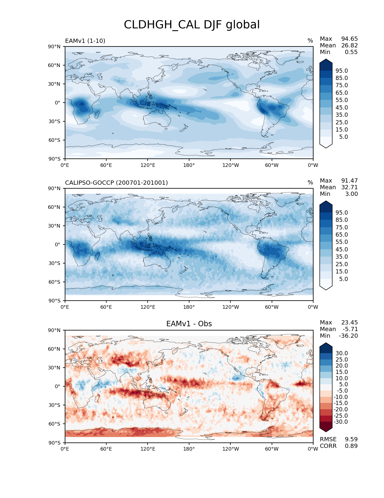 Use this command to recreate this image: | e3sm_diags --no_viewer --variables 'CLDHGH_CAL' --contour_levels '5' '15' '25' '35' '45' '55' '65' '75' '85' '95' --test_data_path '/global/cscratch1/sd/plma/people/for_bryce/climo/v1_f2000/' --diff_levels '-30' '-25' '-20' '-15' '-10' '-5' '5' '10' '15' '20' '25' '30' --backend 'mpl' --canvas_size_h '1628' --reference_colormap 'Blues' --reference_data_path '/global/project/projectdirs/acme/acme_diags/obs_for_e3sm_diags/climatology/' --main_title 'CLDHGH_CAL DJF global' --results_dir '/global/cscratch1/sd/beharrop/people/for_polun/EAMv1/' --regions 'global' --test_colormap 'Blues' --regrid_method 'conservative' --short_test_name 'EAMv1' --figsize '8.5' '11.0' --ref_name 'CALIPSOCOSP' --run_type 'model_vs_obs' --regrid_tool 'esmf' --num_workers '64' --reference_name 'CALIPSO-GOCCP' --output_format 'png' --case_id 'Cloud Calipso' --granulate 'variables' 'seasons' 'regions' 'plevs' --test_name 'v1_f2000' --seasons 'DJF' --arrows --selectors 'sets' 'seasons' --diff_title 'EAMv1 - Obs' --sets 'lat_lon' --diff_colormap 'RdBu' --canvas_size_w '1212' --multiprocessing --dpi '150' |