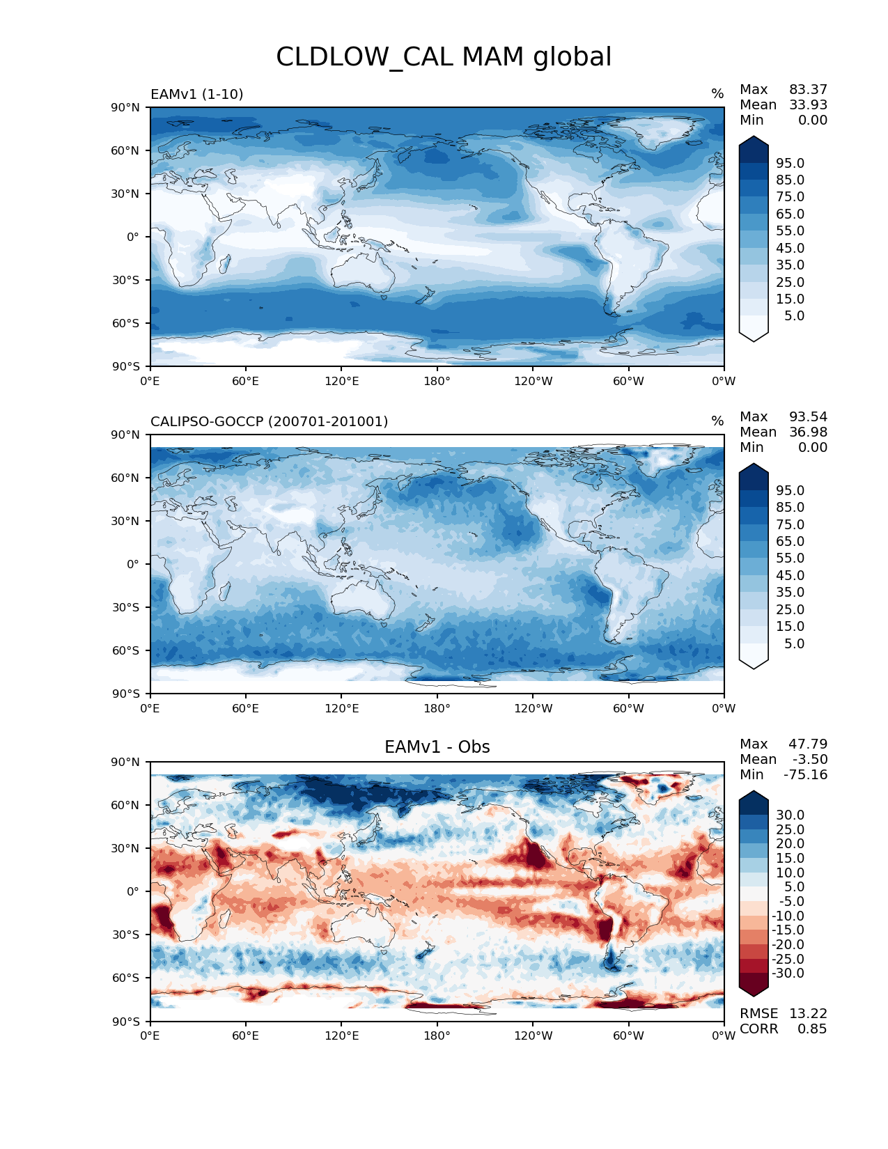 Use this command to recreate this image: | e3sm_diags --no_viewer --variables 'CLDLOW_CAL' --contour_levels '5' '15' '25' '35' '45' '55' '65' '75' '85' '95' --test_data_path '/global/cscratch1/sd/plma/people/for_bryce/climo/v1_f2000/' --diff_levels '-30' '-25' '-20' '-15' '-10' '-5' '5' '10' '15' '20' '25' '30' --backend 'mpl' --canvas_size_h '1628' --reference_colormap 'Blues' --reference_data_path '/global/project/projectdirs/acme/acme_diags/obs_for_e3sm_diags/climatology/' --main_title 'CLDLOW_CAL MAM global' --results_dir '/global/cscratch1/sd/beharrop/people/for_polun/EAMv1/' --regions 'global' --test_colormap 'Blues' --regrid_method 'conservative' --short_test_name 'EAMv1' --figsize '8.5' '11.0' --ref_name 'CALIPSOCOSP' --run_type 'model_vs_obs' --regrid_tool 'esmf' --num_workers '64' --reference_name 'CALIPSO-GOCCP' --output_format 'png' --case_id 'Cloud Calipso' --granulate 'variables' 'seasons' 'regions' 'plevs' --test_name 'v1_f2000' --seasons 'MAM' --arrows --selectors 'sets' 'seasons' --diff_title 'EAMv1 - Obs' --sets 'lat_lon' --diff_colormap 'RdBu' --canvas_size_w '1212' --multiprocessing --dpi '150' |