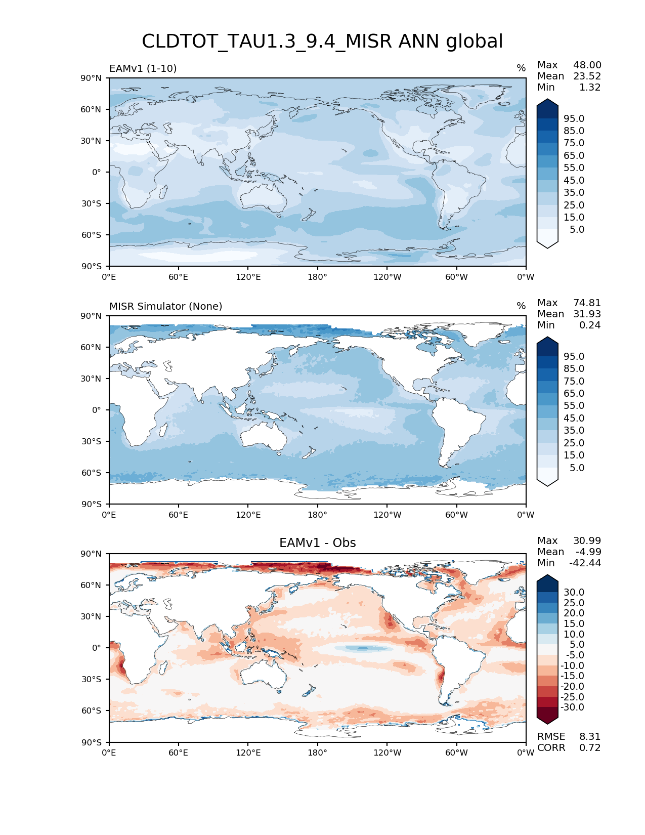 Use this command to recreate this image: | e3sm_diags --no_viewer --variables 'CLDTOT_TAU1.3_9.4_MISR' --contour_levels '5' '15' '25' '35' '45' '55' '65' '75' '85' '95' --test_data_path '/global/cscratch1/sd/plma/people/for_bryce/climo/v1_f2000/' --diff_levels '-30' '-25' '-20' '-15' '-10' '-5' '5' '10' '15' '20' '25' '30' --backend 'mpl' --canvas_size_h '1628' --reference_colormap 'Blues' --reference_data_path '/global/project/projectdirs/acme/acme_diags/obs_for_e3sm_diags/climatology/' --main_title 'CLDTOT_TAU1.3_9.4_MISR ANN global' --results_dir '/global/cscratch1/sd/beharrop/people/for_polun/EAMv1/' --regions 'global' --test_colormap 'Blues' --regrid_method 'conservative' --short_test_name 'EAMv1' --figsize '8.5' '11.0' --ref_name 'MISRCOSP' --run_type 'model_vs_obs' --regrid_tool 'esmf' --num_workers '64' --reference_name 'MISR Simulator' --output_format 'png' --case_id 'Cloud MISR' --granulate 'variables' 'seasons' 'regions' 'plevs' --test_name 'v1_f2000' --seasons 'ANN' --arrows --selectors 'sets' 'seasons' --diff_title 'EAMv1 - Obs' --sets 'lat_lon' --diff_colormap 'RdBu' --canvas_size_w '1212' --multiprocessing --dpi '150' |