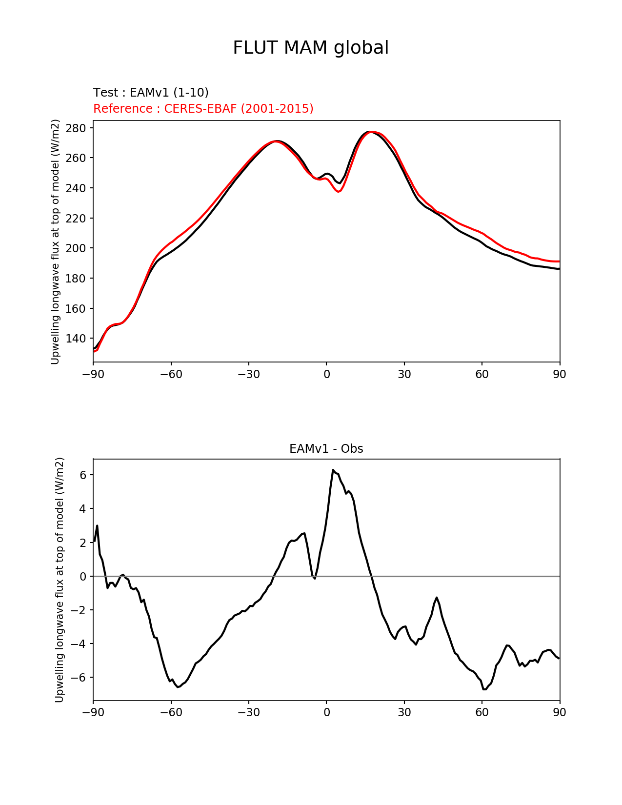 Use this command to recreate this image: | e3sm_diags --no_viewer --short_test_name 'EAMv1' --diff_colormap 'diverging_bwr.rgb' --test_data_path '/global/cscratch1/sd/plma/people/for_bryce/climo/v1_f2000/' --backend 'mpl' --canvas_size_h '1628' --reference_colormap 'cet_rainbow.rgb' --reference_data_path '/global/project/projectdirs/acme/acme_diags/obs_for_e3sm_diags/climatology/' --main_title 'FLUT MAM global' --results_dir '/global/cscratch1/sd/beharrop/people/for_polun/EAMv1/' --regions 'global' --test_colormap 'cet_rainbow.rgb' --regrid_method 'conservative' --variables 'FLUT' --figsize '8.5' '11.0' --ref_name 'ceres_ebaf_toa_v4.0' --run_type 'model_vs_obs' --regrid_tool 'esmf' --num_workers '64' --reference_name 'CERES-EBAF' --output_format 'png' --case_id 'CERES-EBAF-TOA-v4.0' --granulate 'variables' 'seasons' 'regions' 'plevs' --test_name 'v1_f2000' --seasons 'MAM' --arrows --selectors 'sets' 'seasons' --diff_title 'EAMv1 - Obs' --sets 'zonal_mean_xy' --canvas_size_w '1212' --multiprocessing --dpi '150' |