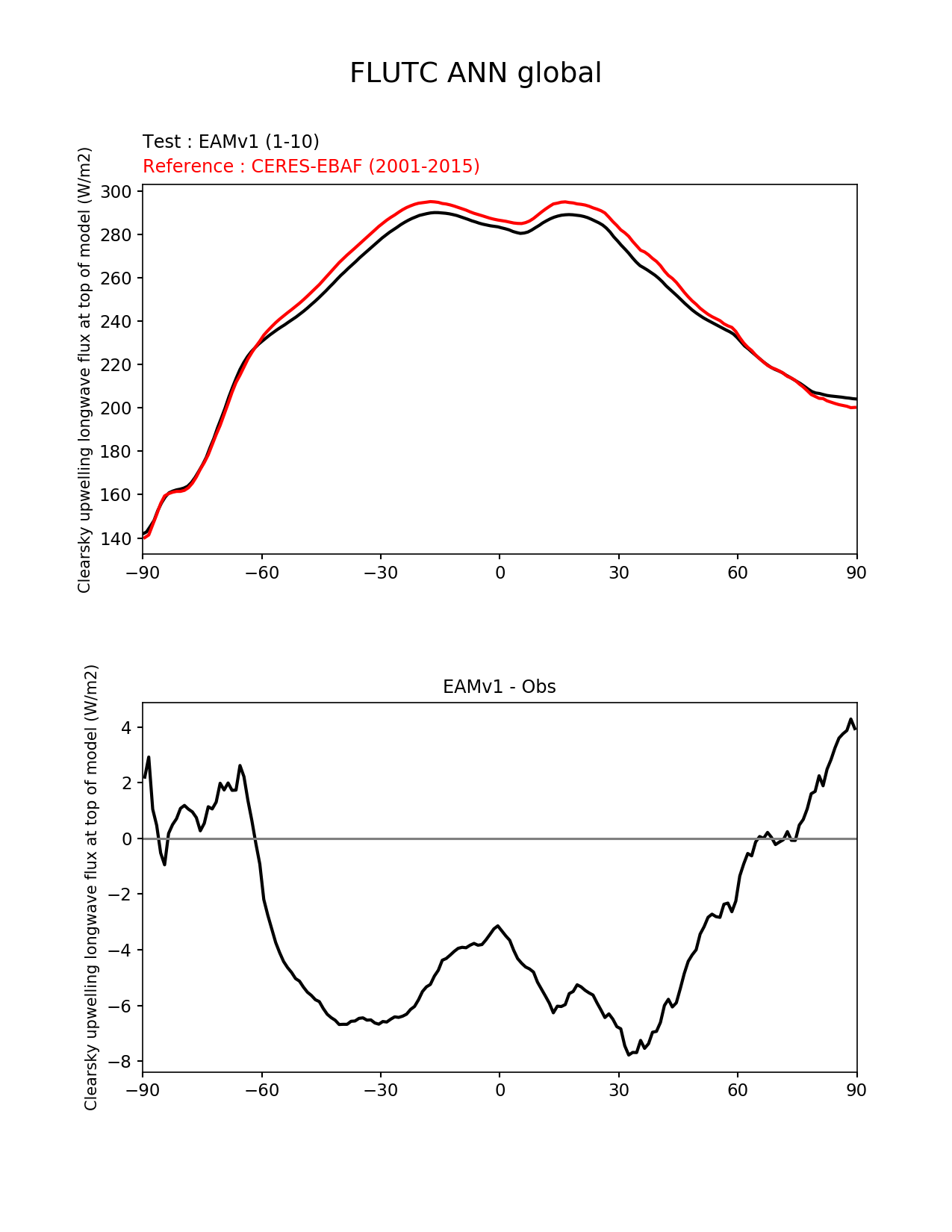 Use this command to recreate this image: | e3sm_diags --no_viewer --short_test_name 'EAMv1' --diff_colormap 'diverging_bwr.rgb' --test_data_path '/global/cscratch1/sd/plma/people/for_bryce/climo/v1_f2000/' --backend 'mpl' --canvas_size_h '1628' --reference_colormap 'cet_rainbow.rgb' --reference_data_path '/global/project/projectdirs/acme/acme_diags/obs_for_e3sm_diags/climatology/' --main_title 'FLUTC ANN global' --results_dir '/global/cscratch1/sd/beharrop/people/for_polun/EAMv1/' --regions 'global' --test_colormap 'cet_rainbow.rgb' --regrid_method 'conservative' --variables 'FLUTC' --figsize '8.5' '11.0' --ref_name 'ceres_ebaf_toa_v4.0' --run_type 'model_vs_obs' --regrid_tool 'esmf' --num_workers '64' --reference_name 'CERES-EBAF' --output_format 'png' --case_id 'CERES-EBAF-TOA-v4.0' --granulate 'variables' 'seasons' 'regions' 'plevs' --test_name 'v1_f2000' --seasons 'ANN' --arrows --selectors 'sets' 'seasons' --diff_title 'EAMv1 - Obs' --sets 'zonal_mean_xy' --canvas_size_w '1212' --multiprocessing --dpi '150' |