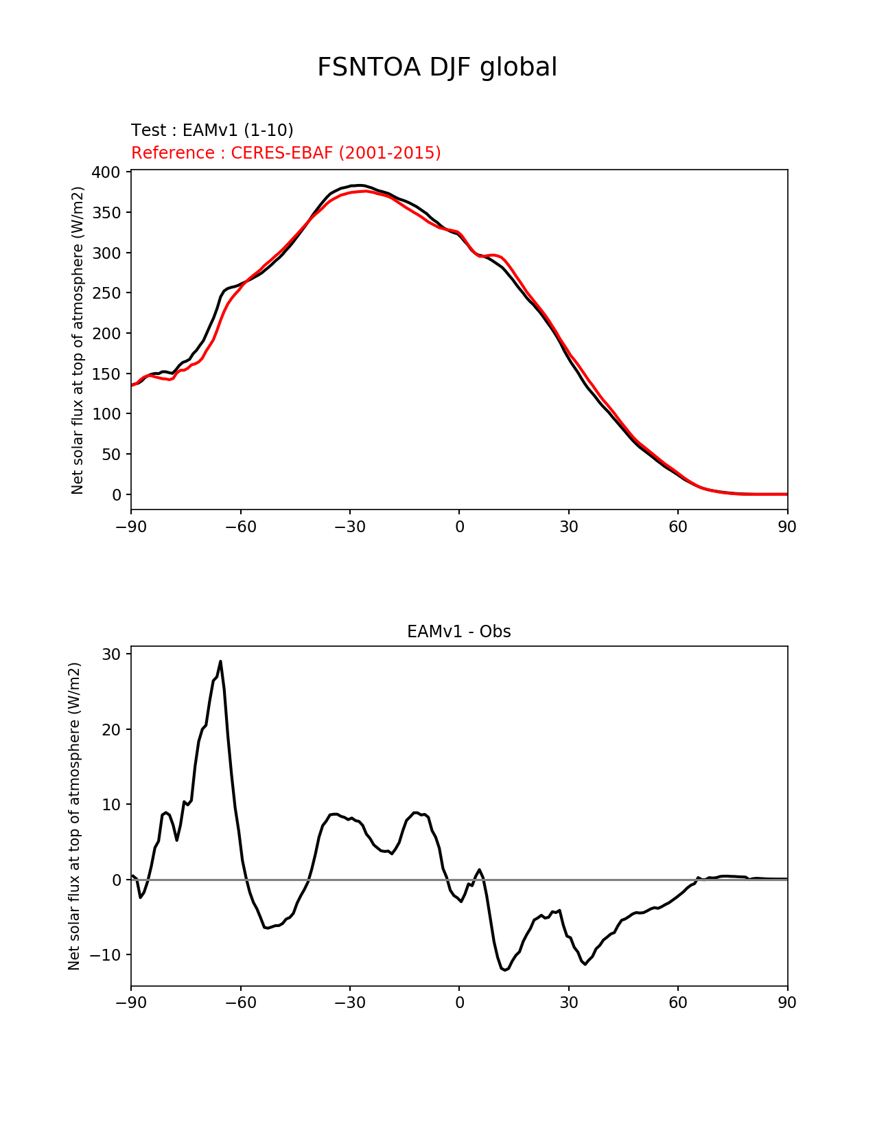 Use this command to recreate this image: | e3sm_diags --no_viewer --short_test_name 'EAMv1' --diff_colormap 'diverging_bwr.rgb' --test_data_path '/global/cscratch1/sd/plma/people/for_bryce/climo/v1_f2000/' --backend 'mpl' --canvas_size_h '1628' --reference_colormap 'cet_rainbow.rgb' --reference_data_path '/global/project/projectdirs/acme/acme_diags/obs_for_e3sm_diags/climatology/' --main_title 'FSNTOA DJF global' --results_dir '/global/cscratch1/sd/beharrop/people/for_polun/EAMv1/' --regions 'global' --test_colormap 'cet_rainbow.rgb' --regrid_method 'conservative' --variables 'FSNTOA' --figsize '8.5' '11.0' --ref_name 'ceres_ebaf_toa_v4.0' --run_type 'model_vs_obs' --regrid_tool 'esmf' --num_workers '64' --reference_name 'CERES-EBAF' --output_format 'png' --case_id 'CERES-EBAF-TOA-v4.0' --granulate 'variables' 'seasons' 'regions' 'plevs' --test_name 'v1_f2000' --seasons 'DJF' --arrows --selectors 'sets' 'seasons' --diff_title 'EAMv1 - Obs' --sets 'zonal_mean_xy' --canvas_size_w '1212' --multiprocessing --dpi '150' |