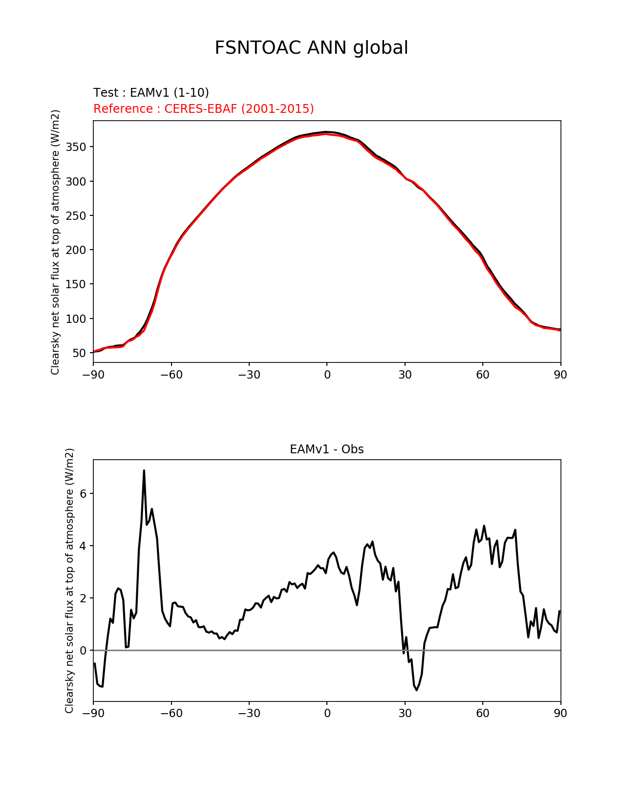 Use this command to recreate this image: | e3sm_diags --no_viewer --short_test_name 'EAMv1' --diff_colormap 'diverging_bwr.rgb' --test_data_path '/global/cscratch1/sd/plma/people/for_bryce/climo/v1_f2000/' --backend 'mpl' --canvas_size_h '1628' --reference_colormap 'cet_rainbow.rgb' --reference_data_path '/global/project/projectdirs/acme/acme_diags/obs_for_e3sm_diags/climatology/' --main_title 'FSNTOAC ANN global' --results_dir '/global/cscratch1/sd/beharrop/people/for_polun/EAMv1/' --regions 'global' --test_colormap 'cet_rainbow.rgb' --regrid_method 'conservative' --variables 'FSNTOAC' --figsize '8.5' '11.0' --ref_name 'ceres_ebaf_toa_v4.0' --run_type 'model_vs_obs' --regrid_tool 'esmf' --num_workers '64' --reference_name 'CERES-EBAF' --output_format 'png' --case_id 'CERES-EBAF-TOA-v4.0' --granulate 'variables' 'seasons' 'regions' 'plevs' --test_name 'v1_f2000' --seasons 'ANN' --arrows --selectors 'sets' 'seasons' --diff_title 'EAMv1 - Obs' --sets 'zonal_mean_xy' --canvas_size_w '1212' --multiprocessing --dpi '150' |