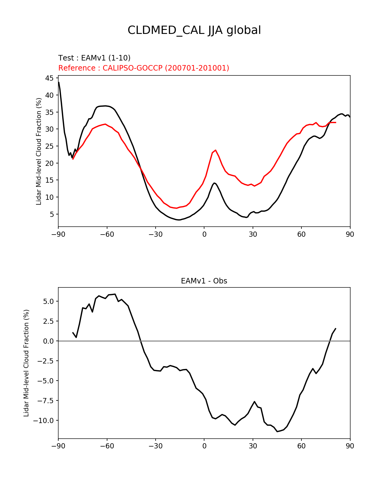 Use this command to recreate this image: | e3sm_diags --no_viewer --short_test_name 'EAMv1' --diff_colormap 'diverging_bwr.rgb' --test_data_path '/global/cscratch1/sd/plma/people/for_bryce/climo/v1_f2000/' --backend 'mpl' --canvas_size_h '1628' --reference_colormap 'cet_rainbow.rgb' --reference_data_path '/global/project/projectdirs/acme/acme_diags/obs_for_e3sm_diags/climatology/' --main_title 'CLDMED_CAL JJA global' --results_dir '/global/cscratch1/sd/beharrop/people/for_polun/EAMv1/' --regions 'global' --test_colormap 'cet_rainbow.rgb' --regrid_method 'conservative' --variables 'CLDMED_CAL' --figsize '8.5' '11.0' --ref_name 'CALIPSOCOSP' --run_type 'model_vs_obs' --regrid_tool 'esmf' --num_workers '64' --reference_name 'CALIPSO-GOCCP' --output_format 'png' --case_id 'Cloud Calipso' --granulate 'variables' 'seasons' 'regions' 'plevs' --test_name 'v1_f2000' --seasons 'JJA' --arrows --selectors 'sets' 'seasons' --diff_title 'EAMv1 - Obs' --sets 'zonal_mean_xy' --canvas_size_w '1212' --multiprocessing --dpi '150' |