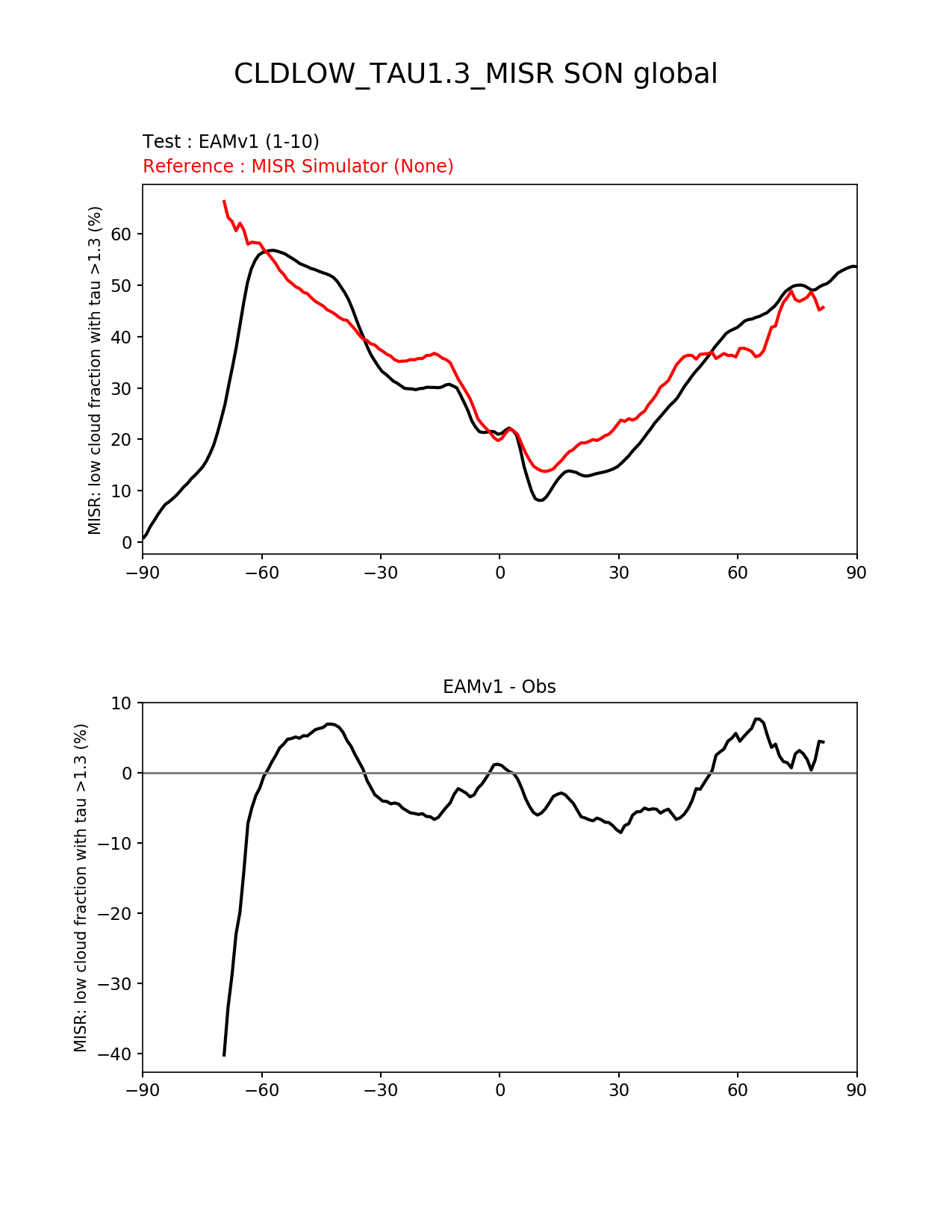 Use this command to recreate this image: | e3sm_diags --no_viewer --short_test_name 'EAMv1' --diff_colormap 'diverging_bwr.rgb' --test_data_path '/global/cscratch1/sd/plma/people/for_bryce/climo/v1_f2000/' --backend 'mpl' --canvas_size_h '1628' --reference_colormap 'cet_rainbow.rgb' --reference_data_path '/global/project/projectdirs/acme/acme_diags/obs_for_e3sm_diags/climatology/' --main_title 'CLDLOW_TAU1.3_MISR SON global' --results_dir '/global/cscratch1/sd/beharrop/people/for_polun/EAMv1/' --regions 'global' --test_colormap 'cet_rainbow.rgb' --regrid_method 'conservative' --variables 'CLDLOW_TAU1.3_MISR' --figsize '8.5' '11.0' --ref_name 'MISRCOSP' --run_type 'model_vs_obs' --regrid_tool 'esmf' --num_workers '64' --reference_name 'MISR Simulator' --output_format 'png' --case_id 'Cloud MISR' --granulate 'variables' 'seasons' 'regions' 'plevs' --test_name 'v1_f2000' --seasons 'SON' --arrows --selectors 'sets' 'seasons' --diff_title 'EAMv1 - Obs' --sets 'zonal_mean_xy' --canvas_size_w '1212' --multiprocessing --dpi '150' |