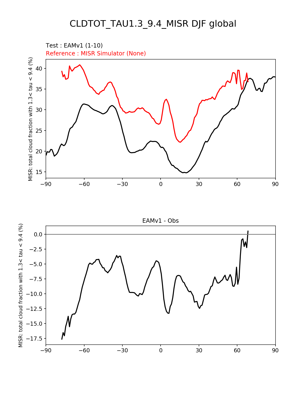 Use this command to recreate this image: | e3sm_diags --no_viewer --short_test_name 'EAMv1' --diff_colormap 'diverging_bwr.rgb' --test_data_path '/global/cscratch1/sd/plma/people/for_bryce/climo/v1_f2000/' --backend 'mpl' --canvas_size_h '1628' --reference_colormap 'cet_rainbow.rgb' --reference_data_path '/global/project/projectdirs/acme/acme_diags/obs_for_e3sm_diags/climatology/' --main_title 'CLDTOT_TAU1.3_9.4_MISR DJF global' --results_dir '/global/cscratch1/sd/beharrop/people/for_polun/EAMv1/' --regions 'global' --test_colormap 'cet_rainbow.rgb' --regrid_method 'conservative' --variables 'CLDTOT_TAU1.3_9.4_MISR' --figsize '8.5' '11.0' --ref_name 'MISRCOSP' --run_type 'model_vs_obs' --regrid_tool 'esmf' --num_workers '64' --reference_name 'MISR Simulator' --output_format 'png' --case_id 'Cloud MISR' --granulate 'variables' 'seasons' 'regions' 'plevs' --test_name 'v1_f2000' --seasons 'DJF' --arrows --selectors 'sets' 'seasons' --diff_title 'EAMv1 - Obs' --sets 'zonal_mean_xy' --canvas_size_w '1212' --multiprocessing --dpi '150' |
