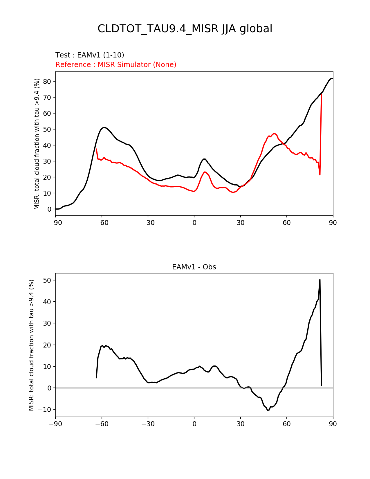 Use this command to recreate this image: | e3sm_diags --no_viewer --short_test_name 'EAMv1' --diff_colormap 'diverging_bwr.rgb' --test_data_path '/global/cscratch1/sd/plma/people/for_bryce/climo/v1_f2000/' --backend 'mpl' --canvas_size_h '1628' --reference_colormap 'cet_rainbow.rgb' --reference_data_path '/global/project/projectdirs/acme/acme_diags/obs_for_e3sm_diags/climatology/' --main_title 'CLDTOT_TAU9.4_MISR JJA global' --results_dir '/global/cscratch1/sd/beharrop/people/for_polun/EAMv1/' --regions 'global' --test_colormap 'cet_rainbow.rgb' --regrid_method 'conservative' --variables 'CLDTOT_TAU9.4_MISR' --figsize '8.5' '11.0' --ref_name 'MISRCOSP' --run_type 'model_vs_obs' --regrid_tool 'esmf' --num_workers '64' --reference_name 'MISR Simulator' --output_format 'png' --case_id 'Cloud MISR' --granulate 'variables' 'seasons' 'regions' 'plevs' --test_name 'v1_f2000' --seasons 'JJA' --arrows --selectors 'sets' 'seasons' --diff_title 'EAMv1 - Obs' --sets 'zonal_mean_xy' --canvas_size_w '1212' --multiprocessing --dpi '150' |