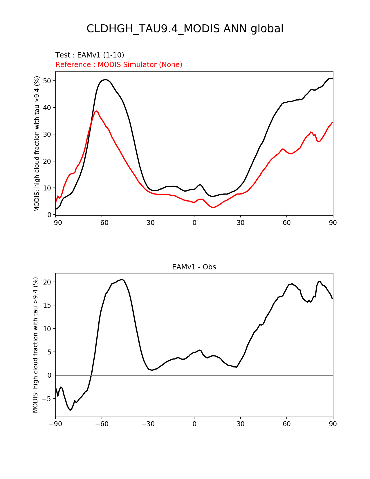 Use this command to recreate this image: | e3sm_diags --no_viewer --short_test_name 'EAMv1' --diff_colormap 'diverging_bwr.rgb' --test_data_path '/global/cscratch1/sd/plma/people/for_bryce/climo/v1_f2000/' --backend 'mpl' --canvas_size_h '1628' --reference_colormap 'cet_rainbow.rgb' --reference_data_path '/global/project/projectdirs/acme/acme_diags/obs_for_e3sm_diags/climatology/' --main_title 'CLDHGH_TAU9.4_MODIS ANN global' --results_dir '/global/cscratch1/sd/beharrop/people/for_polun/EAMv1/' --regions 'global' --test_colormap 'cet_rainbow.rgb' --regrid_method 'conservative' --variables 'CLDHGH_TAU9.4_MODIS' --figsize '8.5' '11.0' --ref_name 'MODISCOSP' --run_type 'model_vs_obs' --regrid_tool 'esmf' --num_workers '64' --reference_name 'MODIS Simulator' --output_format 'png' --case_id 'Cloud MODIS' --granulate 'variables' 'seasons' 'regions' 'plevs' --test_name 'v1_f2000' --seasons 'ANN' --arrows --selectors 'sets' 'seasons' --diff_title 'EAMv1 - Obs' --sets 'zonal_mean_xy' --canvas_size_w '1212' --multiprocessing --dpi '150' |