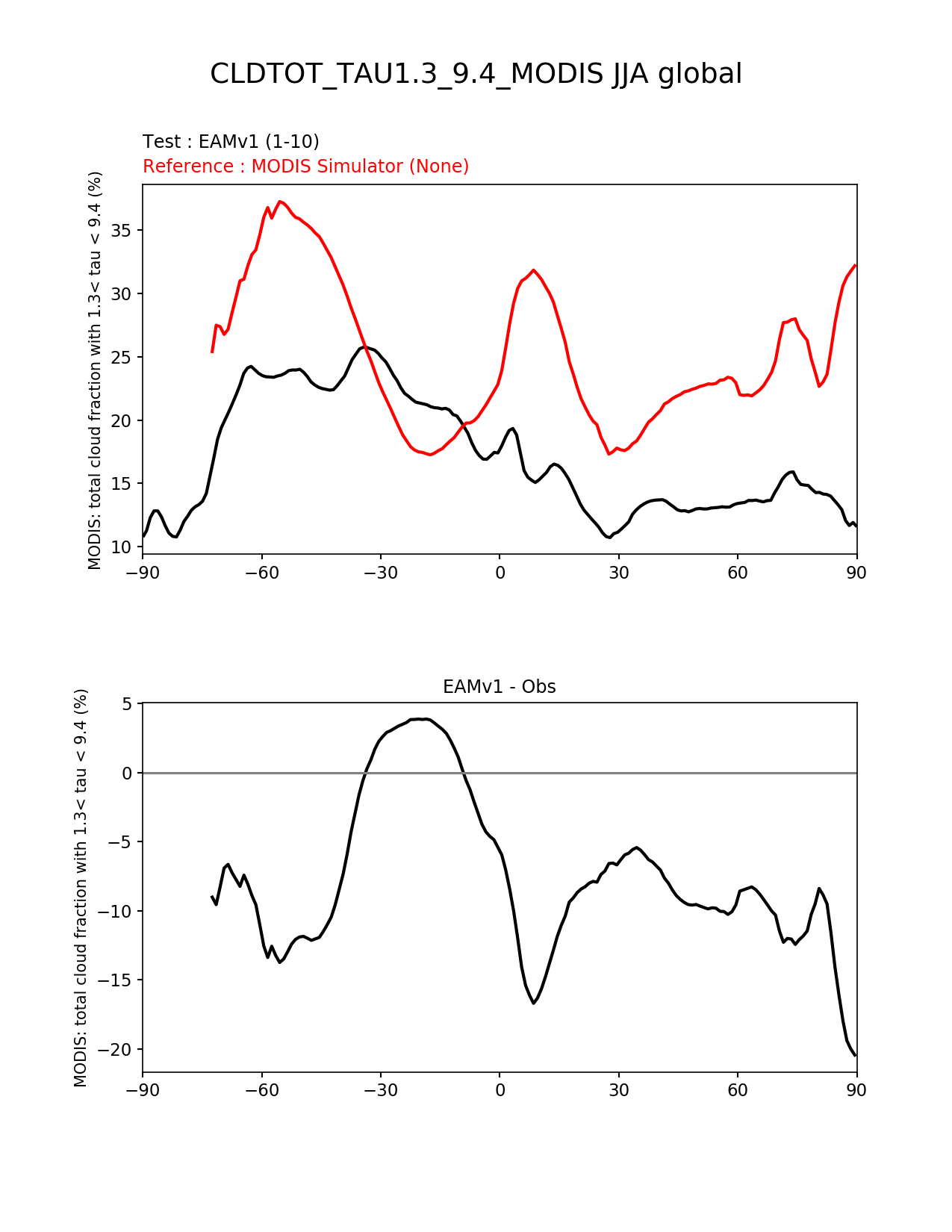 Use this command to recreate this image: | e3sm_diags --no_viewer --short_test_name 'EAMv1' --diff_colormap 'diverging_bwr.rgb' --test_data_path '/global/cscratch1/sd/plma/people/for_bryce/climo/v1_f2000/' --backend 'mpl' --canvas_size_h '1628' --reference_colormap 'cet_rainbow.rgb' --reference_data_path '/global/project/projectdirs/acme/acme_diags/obs_for_e3sm_diags/climatology/' --main_title 'CLDTOT_TAU1.3_9.4_MODIS JJA global' --results_dir '/global/cscratch1/sd/beharrop/people/for_polun/EAMv1/' --regions 'global' --test_colormap 'cet_rainbow.rgb' --regrid_method 'conservative' --variables 'CLDTOT_TAU1.3_9.4_MODIS' --figsize '8.5' '11.0' --ref_name 'MODISCOSP' --run_type 'model_vs_obs' --regrid_tool 'esmf' --num_workers '64' --reference_name 'MODIS Simulator' --output_format 'png' --case_id 'Cloud MODIS' --granulate 'variables' 'seasons' 'regions' 'plevs' --test_name 'v1_f2000' --seasons 'JJA' --arrows --selectors 'sets' 'seasons' --diff_title 'EAMv1 - Obs' --sets 'zonal_mean_xy' --canvas_size_w '1212' --multiprocessing --dpi '150' |