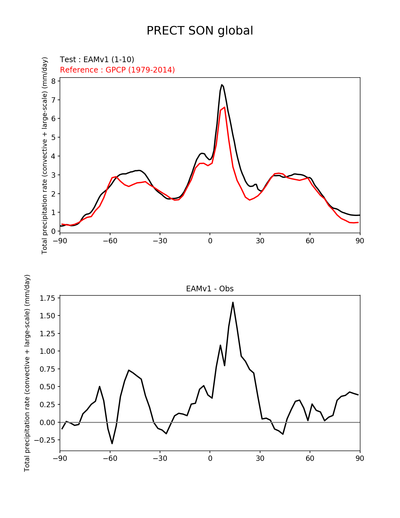 Use this command to recreate this image: | e3sm_diags --no_viewer --variables 'PRECT' --diff_colormap 'diverging_bwr.rgb' --test_data_path '/global/cscratch1/sd/plma/people/for_bryce/climo/v1_f2000/' --backend 'mpl' --canvas_size_h '1628' --reference_colormap 'cet_rainbow.rgb' --reference_data_path '/global/project/projectdirs/acme/acme_diags/obs_for_e3sm_diags/climatology/' --main_title 'PRECT SON global' --results_dir '/global/cscratch1/sd/beharrop/people/for_polun/EAMv1/' --regions 'global' --test_colormap 'cet_rainbow.rgb' --regrid_method 'conservative' --short_test_name 'EAMv1' --figsize '8.5' '11.0' --ref_name 'GPCP_v2.2' --run_type 'model_vs_obs' --regrid_tool 'esmf' --num_workers '64' --reference_name 'GPCP' --output_format 'png' --case_id 'GPCP_v2.2' --granulate 'variables' 'seasons' 'regions' 'plevs' --test_name 'v1_f2000' --seasons 'SON' --arrows --selectors 'sets' 'seasons' --diff_title 'EAMv1 - Obs' --sets 'zonal_mean_xy' --canvas_size_w '1212' --multiprocessing --dpi '150' |