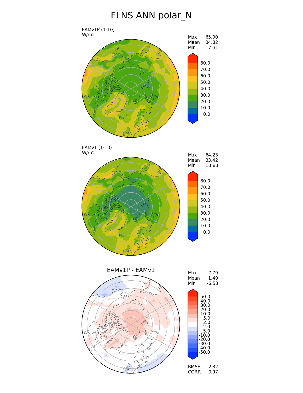 Use this command to recreate this image: | e3sm_diags --no_viewer --variables 'FLNS' --diff_colormap 'diverging_bwr.rgb' --contour_levels '0' '10' '20' '30' '40' '50' '60' '70' '80' --test_data_path '/global/cscratch1/sd/plma/people/for_bryce/climo/v1P_f2000/' --diff_levels '-50' '-40' '-30' '-20' '-10' '-5' '-2' '2' '5' '10' '20' '30' '40' '50' --backend 'mpl' --canvas_size_h '1628' --reference_colormap 'cet_rainbow.rgb' --reference_data_path '/global/cscratch1/sd/plma/people/for_bryce/climo/v1_f2000/' --main_title 'FLNS ANN polar_N' --results_dir '/global/cscratch1/sd/beharrop/people/for_polun/EAMv1P-EAMv1/' --regions 'polar_N' --test_colormap 'cet_rainbow.rgb' --regrid_method 'conservative' --short_test_name 'EAMv1P' --figsize '8.5' '11.0' --canvas_size_w '1212' --run_type 'model_vs_model' --regrid_tool 'esmf' --num_workers '64' --output_format 'png' --case_id 'model_vs_model' --granulate 'variables' 'seasons' 'regions' 'plevs' --test_name 'v1P_f2000' --seasons 'ANN' --arrows --selectors 'sets' 'seasons' --diff_title 'EAMv1P - EAMv1' --sets 'polar' --ref_name 'v1_f2000' --multiprocessing --dpi '150' |