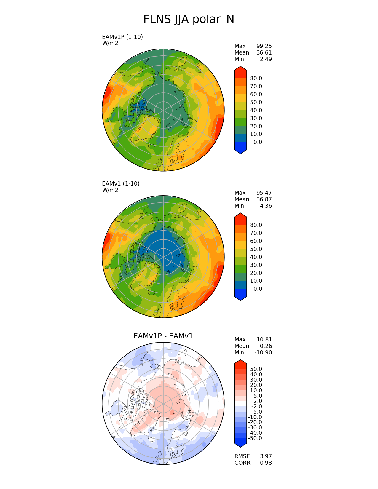 Use this command to recreate this image: | e3sm_diags --no_viewer --variables 'FLNS' --diff_colormap 'diverging_bwr.rgb' --contour_levels '0' '10' '20' '30' '40' '50' '60' '70' '80' --test_data_path '/global/cscratch1/sd/plma/people/for_bryce/climo/v1P_f2000/' --diff_levels '-50' '-40' '-30' '-20' '-10' '-5' '-2' '2' '5' '10' '20' '30' '40' '50' --backend 'mpl' --canvas_size_h '1628' --reference_colormap 'cet_rainbow.rgb' --reference_data_path '/global/cscratch1/sd/plma/people/for_bryce/climo/v1_f2000/' --main_title 'FLNS JJA polar_N' --results_dir '/global/cscratch1/sd/beharrop/people/for_polun/EAMv1P-EAMv1/' --regions 'polar_N' --test_colormap 'cet_rainbow.rgb' --regrid_method 'conservative' --short_test_name 'EAMv1P' --figsize '8.5' '11.0' --canvas_size_w '1212' --run_type 'model_vs_model' --regrid_tool 'esmf' --num_workers '64' --output_format 'png' --case_id 'model_vs_model' --granulate 'variables' 'seasons' 'regions' 'plevs' --test_name 'v1P_f2000' --seasons 'JJA' --arrows --selectors 'sets' 'seasons' --diff_title 'EAMv1P - EAMv1' --sets 'polar' --ref_name 'v1_f2000' --multiprocessing --dpi '150' |