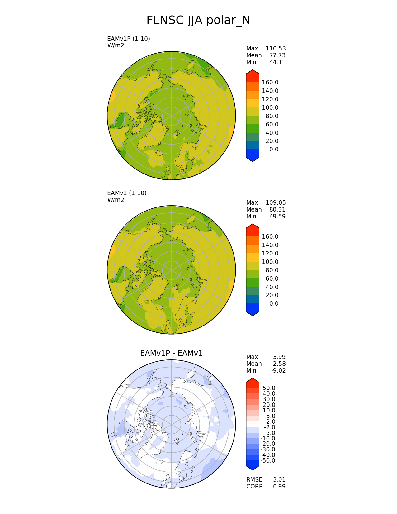 Use this command to recreate this image: | e3sm_diags --no_viewer --variables 'FLNSC' --diff_colormap 'diverging_bwr.rgb' --contour_levels '0' '20' '40' '60' '80' '100' '120' '140' '160' --test_data_path '/global/cscratch1/sd/plma/people/for_bryce/climo/v1P_f2000/' --diff_levels '-50' '-40' '-30' '-20' '-10' '-5' '-2' '2' '5' '10' '20' '30' '40' '50' --backend 'mpl' --canvas_size_h '1628' --reference_colormap 'cet_rainbow.rgb' --reference_data_path '/global/cscratch1/sd/plma/people/for_bryce/climo/v1_f2000/' --main_title 'FLNSC JJA polar_N' --results_dir '/global/cscratch1/sd/beharrop/people/for_polun/EAMv1P-EAMv1/' --regions 'polar_N' --test_colormap 'cet_rainbow.rgb' --regrid_method 'conservative' --short_test_name 'EAMv1P' --figsize '8.5' '11.0' --canvas_size_w '1212' --run_type 'model_vs_model' --regrid_tool 'esmf' --num_workers '64' --output_format 'png' --case_id 'model_vs_model' --granulate 'variables' 'seasons' 'regions' 'plevs' --test_name 'v1P_f2000' --seasons 'JJA' --arrows --selectors 'sets' 'seasons' --diff_title 'EAMv1P - EAMv1' --sets 'polar' --ref_name 'v1_f2000' --multiprocessing --dpi '150' |