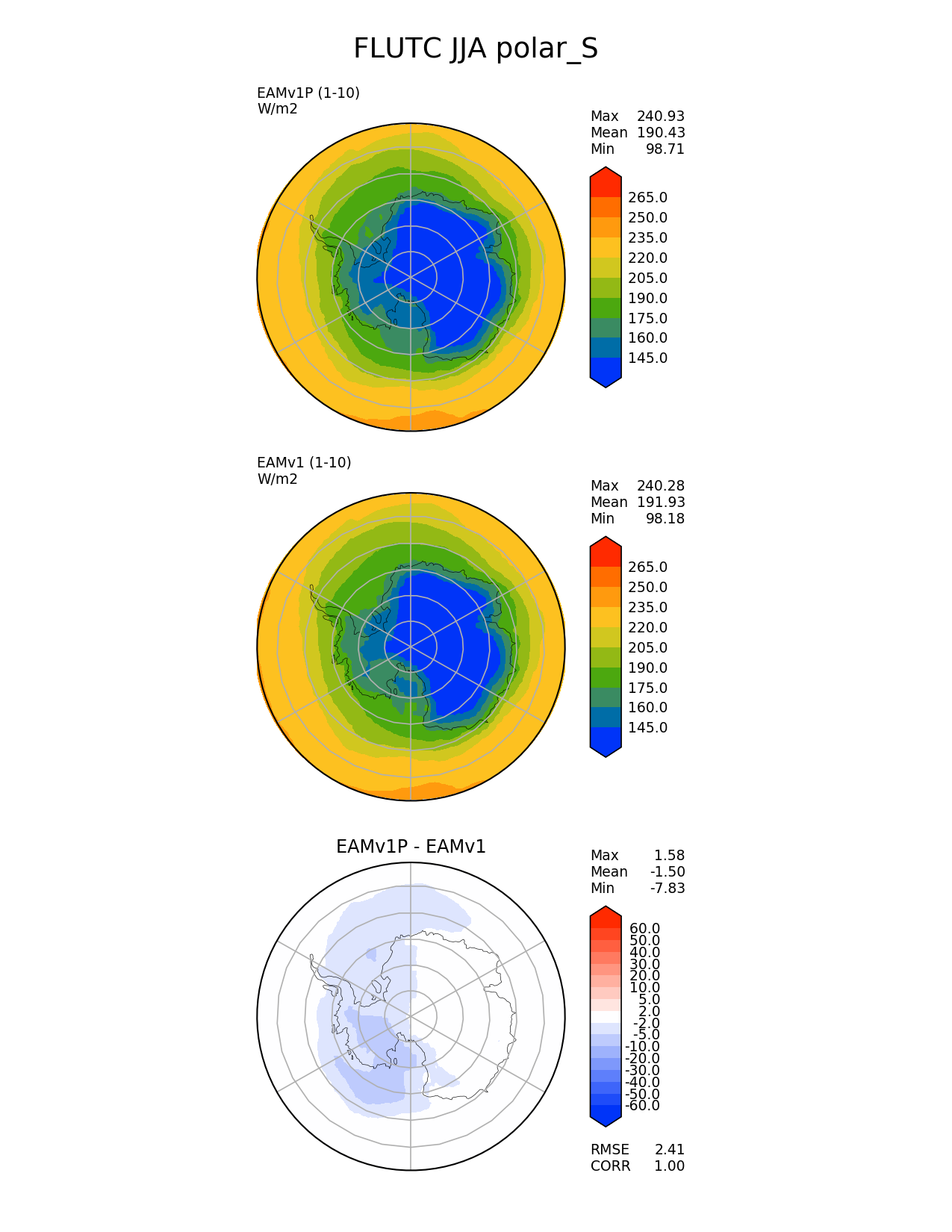 Use this command to recreate this image: | e3sm_diags --no_viewer --variables 'FLUTC' --diff_colormap 'diverging_bwr.rgb' --contour_levels '145' '160' '175' '190' '205' '220' '235' '250' '265' --test_data_path '/global/cscratch1/sd/plma/people/for_bryce/climo/v1P_f2000/' --diff_levels '-60' '-50' '-40' '-30' '-20' '-10' '-5' '-2' '2' '5' '10' '20' '30' '40' '50' '60' --backend 'mpl' --canvas_size_h '1628' --reference_colormap 'cet_rainbow.rgb' --reference_data_path '/global/cscratch1/sd/plma/people/for_bryce/climo/v1_f2000/' --main_title 'FLUTC JJA polar_S' --results_dir '/global/cscratch1/sd/beharrop/people/for_polun/EAMv1P-EAMv1/' --regions 'polar_S' --test_colormap 'cet_rainbow.rgb' --regrid_method 'conservative' --short_test_name 'EAMv1P' --figsize '8.5' '11.0' --canvas_size_w '1212' --run_type 'model_vs_model' --regrid_tool 'esmf' --num_workers '64' --output_format 'png' --case_id 'model_vs_model' --granulate 'variables' 'seasons' 'regions' 'plevs' --test_name 'v1P_f2000' --seasons 'JJA' --arrows --selectors 'sets' 'seasons' --diff_title 'EAMv1P - EAMv1' --sets 'polar' --ref_name 'v1_f2000' --multiprocessing --dpi '150' |