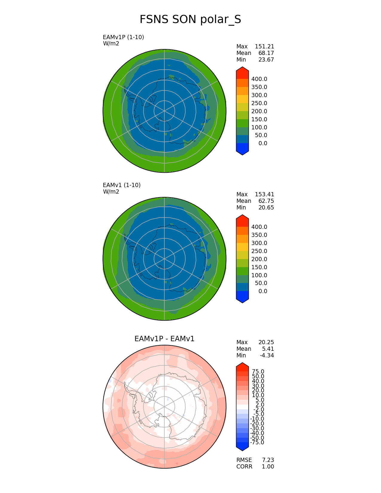 Use this command to recreate this image: | e3sm_diags --no_viewer --variables 'FSNS' --diff_colormap 'diverging_bwr.rgb' --contour_levels '0' '50' '100' '150' '200' '250' '300' '350' '400' --test_data_path '/global/cscratch1/sd/plma/people/for_bryce/climo/v1P_f2000/' --diff_levels '-75' '-50' '-40' '-30' '-20' '-10' '-5' '-2' '2' '5' '10' '20' '30' '40' '50' '75' --backend 'mpl' --canvas_size_h '1628' --reference_colormap 'cet_rainbow.rgb' --reference_data_path '/global/cscratch1/sd/plma/people/for_bryce/climo/v1_f2000/' --main_title 'FSNS SON polar_S' --results_dir '/global/cscratch1/sd/beharrop/people/for_polun/EAMv1P-EAMv1/' --regions 'polar_S' --test_colormap 'cet_rainbow.rgb' --regrid_method 'conservative' --short_test_name 'EAMv1P' --figsize '8.5' '11.0' --canvas_size_w '1212' --run_type 'model_vs_model' --regrid_tool 'esmf' --num_workers '64' --output_format 'png' --case_id 'model_vs_model' --granulate 'variables' 'seasons' 'regions' 'plevs' --test_name 'v1P_f2000' --seasons 'SON' --arrows --selectors 'sets' 'seasons' --diff_title 'EAMv1P - EAMv1' --sets 'polar' --ref_name 'v1_f2000' --multiprocessing --dpi '150' |