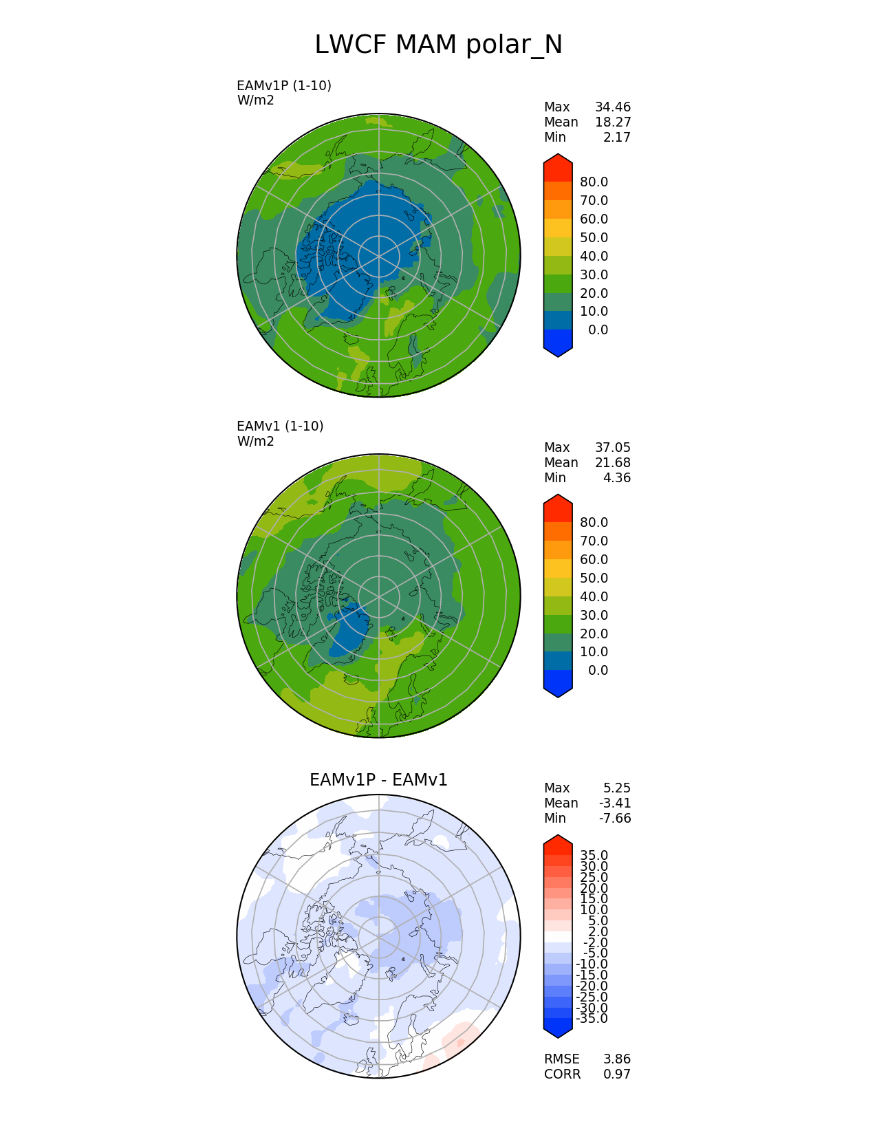 Use this command to recreate this image: | e3sm_diags --no_viewer --variables 'LWCF' --diff_colormap 'diverging_bwr.rgb' --contour_levels '0' '10' '20' '30' '40' '50' '60' '70' '80' --test_data_path '/global/cscratch1/sd/plma/people/for_bryce/climo/v1P_f2000/' --diff_levels '-35' '-30' '-25' '-20' '-15' '-10' '-5' '-2' '2' '5' '10' '15' '20' '25' '30' '35' --backend 'mpl' --canvas_size_h '1628' --reference_colormap 'cet_rainbow.rgb' --reference_data_path '/global/cscratch1/sd/plma/people/for_bryce/climo/v1_f2000/' --main_title 'LWCF MAM polar_N' --results_dir '/global/cscratch1/sd/beharrop/people/for_polun/EAMv1P-EAMv1/' --regions 'polar_N' --test_colormap 'cet_rainbow.rgb' --regrid_method 'conservative' --short_test_name 'EAMv1P' --figsize '8.5' '11.0' --canvas_size_w '1212' --run_type 'model_vs_model' --regrid_tool 'esmf' --num_workers '64' --output_format 'png' --case_id 'model_vs_model' --granulate 'variables' 'seasons' 'regions' 'plevs' --test_name 'v1P_f2000' --seasons 'MAM' --arrows --selectors 'sets' 'seasons' --diff_title 'EAMv1P - EAMv1' --sets 'polar' --ref_name 'v1_f2000' --multiprocessing --dpi '150' |
