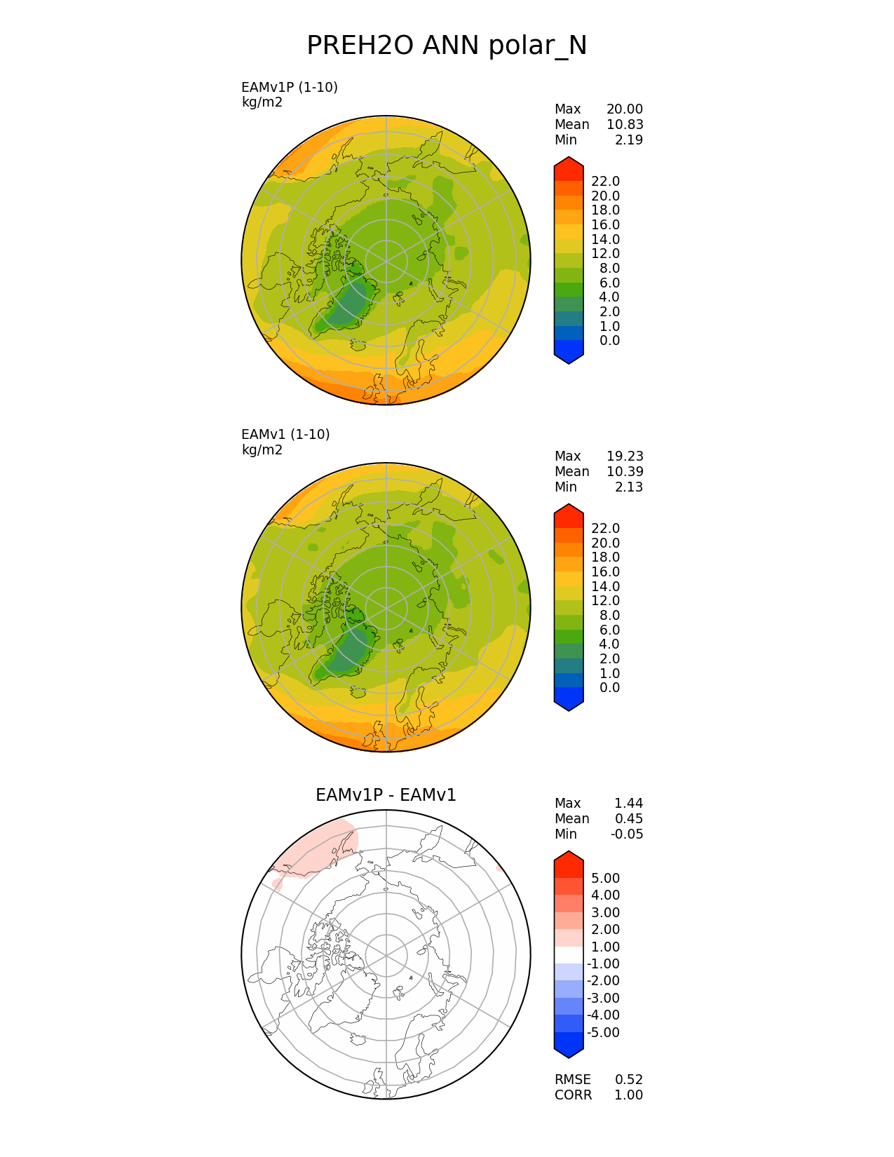 Use this command to recreate this image: | e3sm_diags --no_viewer --variables 'PREH2O' --diff_colormap 'diverging_bwr.rgb' --contour_levels '0' '1' '2' '4' '6' '8' '12' '14' '16' '18' '20' '22' --test_data_path '/global/cscratch1/sd/plma/people/for_bryce/climo/v1P_f2000/' --diff_levels '-5' '-4' '-3' '-2' '-1' '1' '2' '3' '4' '5' --backend 'mpl' --canvas_size_h '1628' --reference_colormap 'cet_rainbow.rgb' --reference_data_path '/global/cscratch1/sd/plma/people/for_bryce/climo/v1_f2000/' --main_title 'PREH2O ANN polar_N' --results_dir '/global/cscratch1/sd/beharrop/people/for_polun/EAMv1P-EAMv1/' --regions 'polar_N' --test_colormap 'cet_rainbow.rgb' --regrid_method 'conservative' --short_test_name 'EAMv1P' --figsize '8.5' '11.0' --canvas_size_w '1212' --run_type 'model_vs_model' --regrid_tool 'esmf' --num_workers '64' --output_format 'png' --case_id 'model_vs_model' --granulate 'variables' 'seasons' 'regions' 'plevs' --test_name 'v1P_f2000' --seasons 'ANN' --arrows --selectors 'sets' 'seasons' --diff_title 'EAMv1P - EAMv1' --sets 'polar' --ref_name 'v1_f2000' --multiprocessing --dpi '150' |