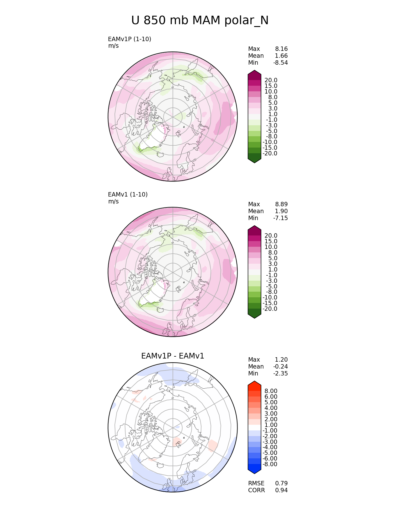Use this command to recreate this image: | e3sm_diags --no_viewer --variables 'U' --diff_colormap 'diverging_bwr.rgb' --contour_levels '-20' '-15' '-10' '-8' '-5' '-3' '-1' '1' '3' '5' '8' '10' '15' '20' --test_data_path '/global/cscratch1/sd/plma/people/for_bryce/climo/v1P_f2000/' --diff_levels '-8' '-6' '-5' '-4' '-3' '-2' '-1' '1' '2' '3' '4' '5' '6' '8' --backend 'mpl' --canvas_size_h '1628' --reference_colormap 'PiYG_r' --reference_data_path '/global/cscratch1/sd/plma/people/for_bryce/climo/v1_f2000/' --main_title 'U 850 mb MAM polar_N' --results_dir '/global/cscratch1/sd/beharrop/people/for_polun/EAMv1P-EAMv1/' --regions 'polar_N' --test_colormap 'PiYG_r' --regrid_method 'conservative' --short_test_name 'EAMv1P' --figsize '8.5' '11.0' --canvas_size_w '1212' --run_type 'model_vs_model' --regrid_tool 'esmf' --num_workers '64' --output_format 'png' --case_id 'model_vs_model' --granulate 'variables' 'seasons' 'regions' 'plevs' --test_name 'v1P_f2000' --seasons 'MAM' --arrows --selectors 'sets' 'seasons' --diff_title 'EAMv1P - EAMv1' --sets 'polar' --plevs '850.0' --ref_name 'v1_f2000' --multiprocessing --dpi '150' |