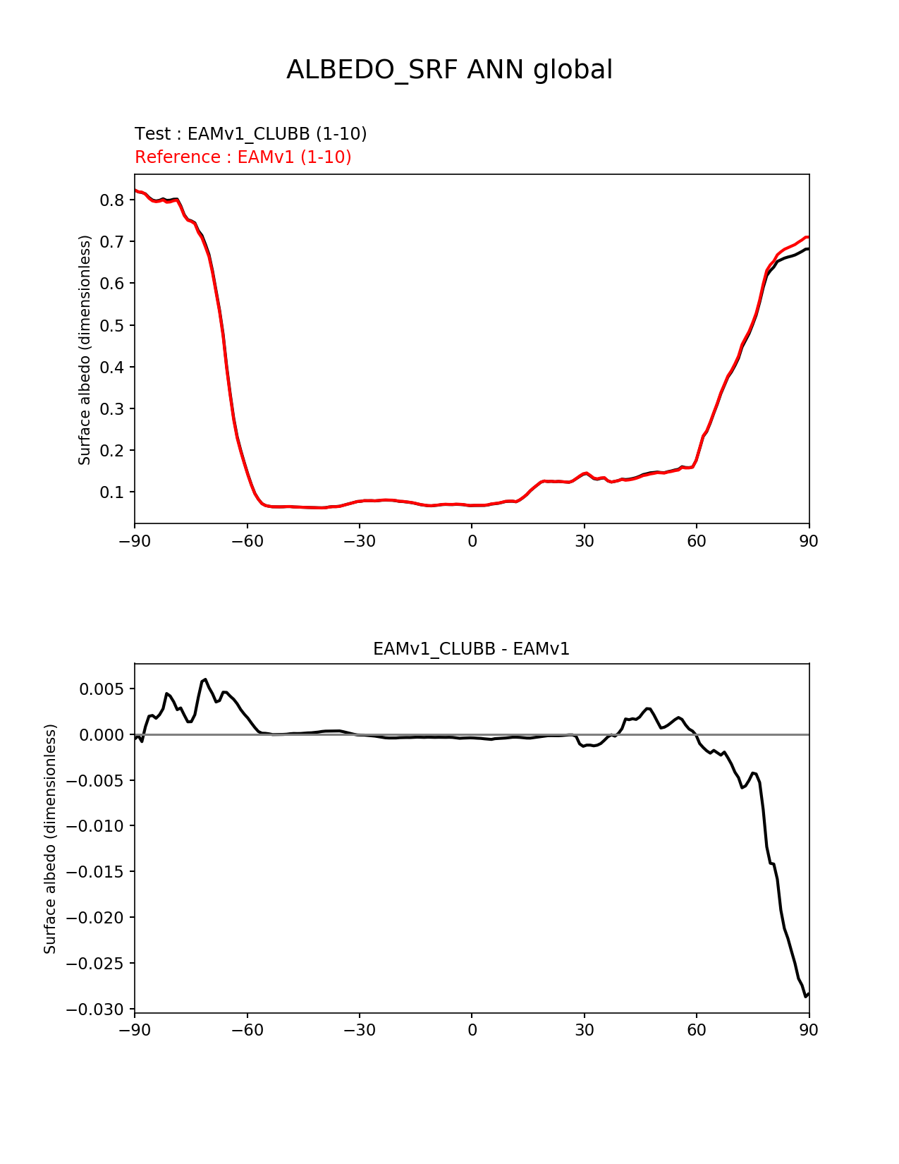 Use this command to recreate this image: | e3sm_diags --no_viewer --variables 'ALBEDO_SRF' --diff_colormap 'diverging_bwr.rgb' --test_data_path '/global/cscratch1/sd/plma/people/for_bryce/climo/v1_clubb_f2000/' --backend 'mpl' --canvas_size_h '1628' --reference_colormap 'cet_rainbow.rgb' --reference_data_path '/global/cscratch1/sd/plma/people/for_bryce/climo/v1_f2000/' --main_title 'ALBEDO_SRF ANN global' --results_dir '/global/cscratch1/sd/beharrop/people/for_polun/EAMv1_CLUBB-EAMv1/' --regions 'global' --test_colormap 'cet_rainbow.rgb' --regrid_method 'conservative' --short_test_name 'EAMv1_CLUBB' --figsize '8.5' '11.0' --canvas_size_w '1212' --run_type 'model_vs_model' --regrid_tool 'esmf' --num_workers '64' --output_format 'png' --case_id 'model_vs_model' --granulate 'variables' 'seasons' 'regions' 'plevs' --test_name 'v1_clubb_f2000' --seasons 'ANN' --arrows --selectors 'sets' 'seasons' --diff_title 'EAMv1_CLUBB - EAMv1' --sets 'zonal_mean_xy' --ref_name 'v1_f2000' --multiprocessing --dpi '150' |