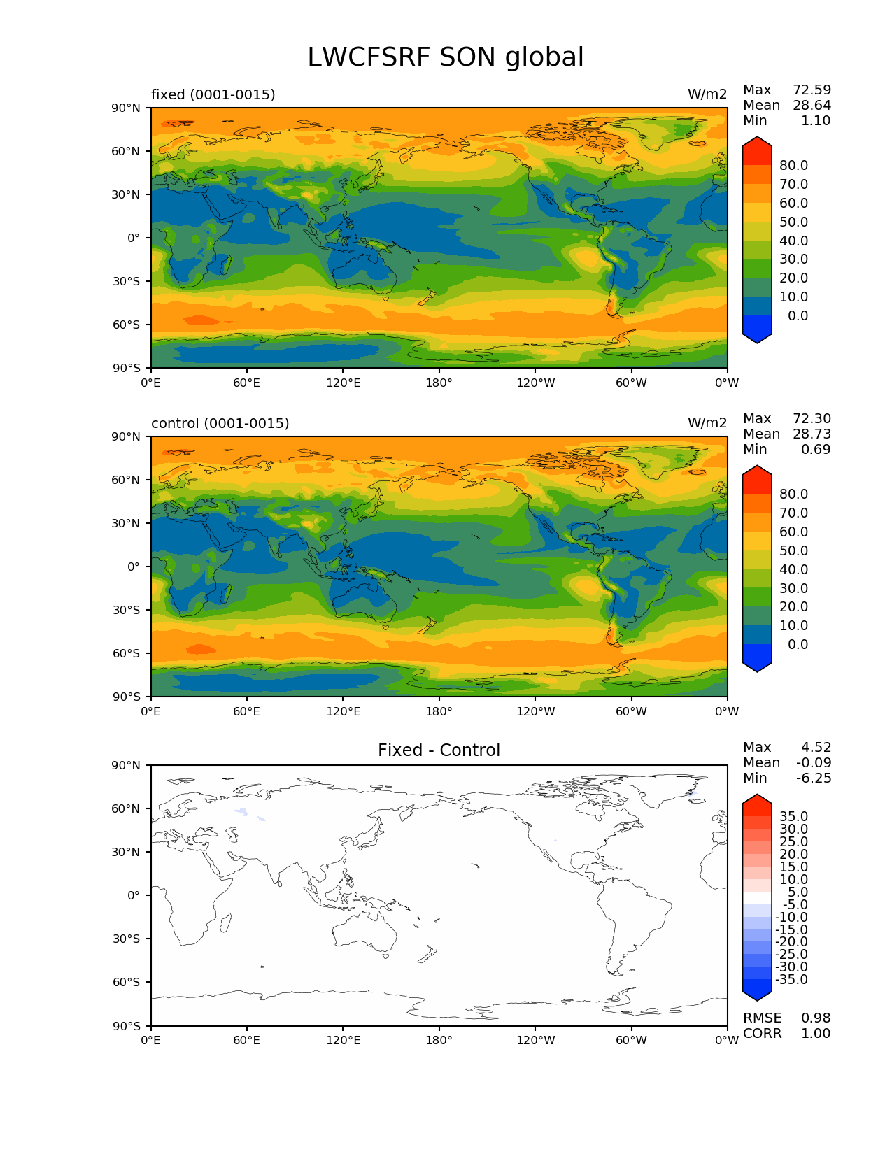 Use this command to recreate this image: | e3sm_diags --no_viewer --variables 'LWCFSRF' --diff_colormap 'diverging_bwr.rgb' --contour_levels '0' '10' '20' '30' '40' '50' '60' '70' '80' --test_data_path '/global/cscratch1/sd/beharrop/acme_scratch/cori-knl/test_tracer_cons_bugfix1/reg_climo/test_tracer_cons_bugfix1/yrs0001_0015/' --diff_levels '-35' '-30' '-25' '-20' '-15' '-10' '-5' '5' '10' '15' '20' '25' '30' '35' --backend 'mpl' --canvas_size_h '1628' --reference_colormap 'cet_rainbow.rgb' --reference_data_path '/global/cscratch1/sd/beharrop/acme_scratch/cori-knl/control_tracer_cons_bugfix1/reg_climo/control_tracer_cons_bugfix1/yrs0001_0015/' --main_title 'LWCFSRF SON global' --results_dir '/global/cscratch1/sd/beharrop/temp/e3sm_bugfix_test_1year/' --regions 'global' --test_colormap 'cet_rainbow.rgb' --regrid_method 'conservative' --short_test_name 'fixed' --figsize '8.5' '11.0' --canvas_size_w '1212' --run_type 'model_vs_model' --regrid_tool 'esmf' --num_workers '64' --output_format 'png' --case_id 'model_vs_model' --granulate 'variables' 'seasons' 'regions' 'plevs' --test_name 'test_tracer_cons_bugfix1' --seasons 'SON' --arrows --selectors 'sets' 'seasons' --diff_title 'Fixed - Control' --sets 'lat_lon' --ref_name 'control_tracer_cons_bugfix1' --multiprocessing --dpi '150' |