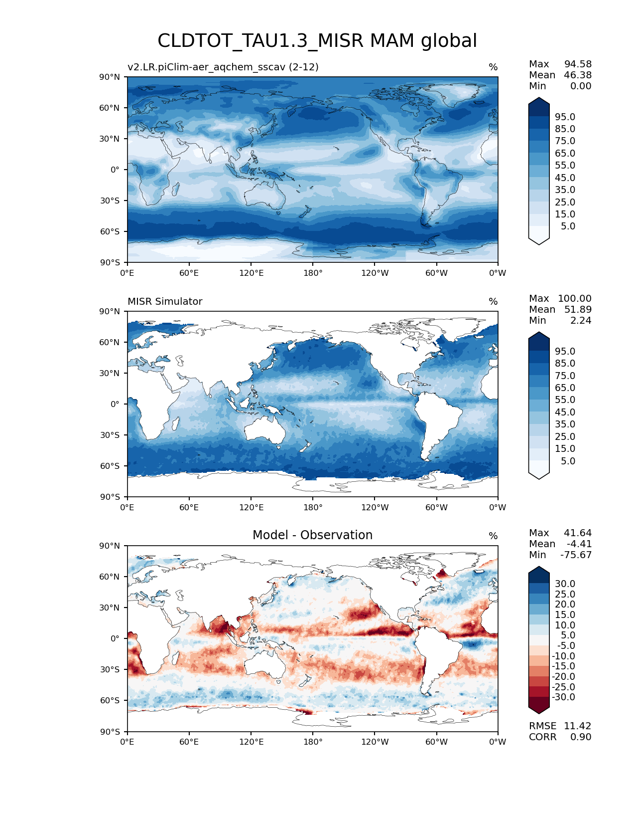 Use this command to recreate this image: | e3sm_diags lat_lon --no_viewer --case_id 'Cloud MISR' --sets 'lat_lon' --run_type 'model_vs_obs' --variables 'CLDTOT_TAU1.3_MISR' --seasons 'MAM' --regions 'global' --regrid_tool 'esmf' --regrid_method 'conservative' --main_title 'CLDTOT_TAU1.3_MISR MAM global' --backend 'mpl' --output_format 'png' --canvas_size_w '1212' --canvas_size_h '1628' --figsize '8.5' '11.0' --dpi '150' --arrows --contour_levels '5' '15' '25' '35' '45' '55' '65' '75' '85' '95' --test_name 'v2.LR.piClim-aer_oxid_sscav_tuning_off_reduced_so4_aqchem' --short_test_name 'v2.LR.piClim-aer_aqchem_sscav' --test_colormap 'Blues' --ref_name 'MISRCOSP' --reference_name 'MISR Simulator' --reference_colormap 'Blues' --diff_title 'Model - Observation' --diff_colormap 'RdBu' --diff_levels '-30' '-25' '-20' '-15' '-10' '-5' '5' '10' '15' '20' '25' '30' --multiprocessing --num_workers '32' --granulate 'variables' 'seasons' 'plevs' 'regions' --selectors 'sets' 'seasons' --reference_data_path '/global/cfs/cdirs/e3sm/acme_diags/obs_for_e3sm_diags/climatology/' --test_data_path '/global/cscratch1/sd/beydoun/E3SMv2/v2.LR.piClim-aer_oxid_sscav_tuning_off_reduced_so4_aqchem/run/climo/rgr' --results_dir '/global/cfs/cdirs/e3sm/www/beydoun/v2.LR.piClim-aer_aqchem_sscav' |