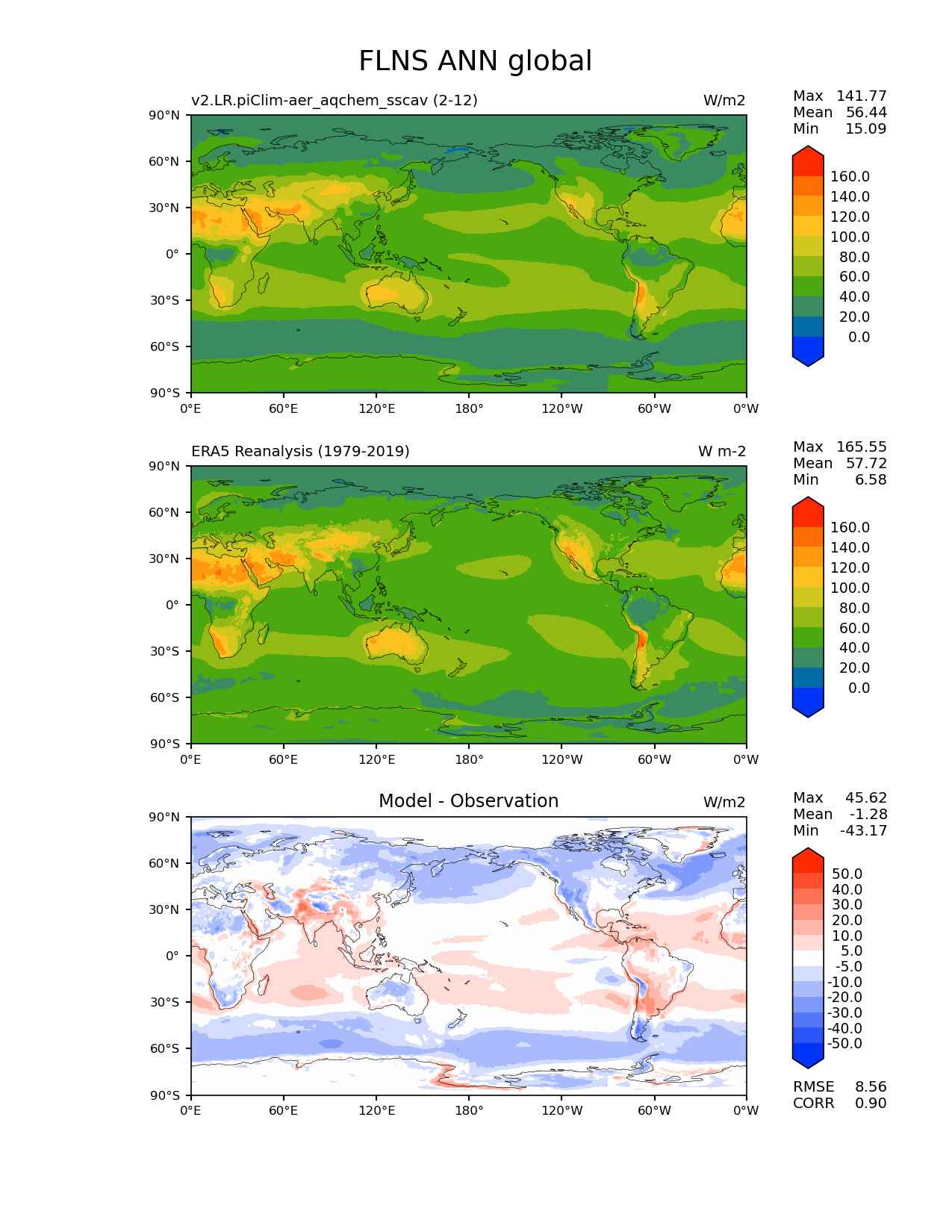 Use this command to recreate this image: | e3sm_diags lat_lon --no_viewer --case_id 'ERA5' --sets 'lat_lon' --run_type 'model_vs_obs' --variables 'FLNS' --seasons 'ANN' --regions 'global' --regrid_tool 'esmf' --regrid_method 'conservative' --main_title 'FLNS ANN global' --backend 'mpl' --output_format 'png' --canvas_size_w '1212' --canvas_size_h '1628' --figsize '8.5' '11.0' --dpi '150' --arrows --contour_levels '0' '20' '40' '60' '80' '100' '120' '140' '160' --test_name 'v2.LR.piClim-aer_oxid_sscav_tuning_off_reduced_so4_aqchem' --short_test_name 'v2.LR.piClim-aer_aqchem_sscav' --test_colormap 'cet_rainbow.rgb' --ref_name 'ERA5' --reference_name 'ERA5 Reanalysis' --reference_colormap 'cet_rainbow.rgb' --diff_title 'Model - Observation' --diff_colormap 'diverging_bwr.rgb' --diff_levels '-50' '-40' '-30' '-20' '-10' '-5' '5' '10' '20' '30' '40' '50' --multiprocessing --num_workers '32' --granulate 'variables' 'seasons' 'plevs' 'regions' --selectors 'sets' 'seasons' --reference_data_path '/global/cfs/cdirs/e3sm/acme_diags/obs_for_e3sm_diags/climatology/' --test_data_path '/global/cscratch1/sd/beydoun/E3SMv2/v2.LR.piClim-aer_oxid_sscav_tuning_off_reduced_so4_aqchem/run/climo/rgr' --results_dir '/global/cfs/cdirs/e3sm/www/beydoun/v2.LR.piClim-aer_aqchem_sscav' |