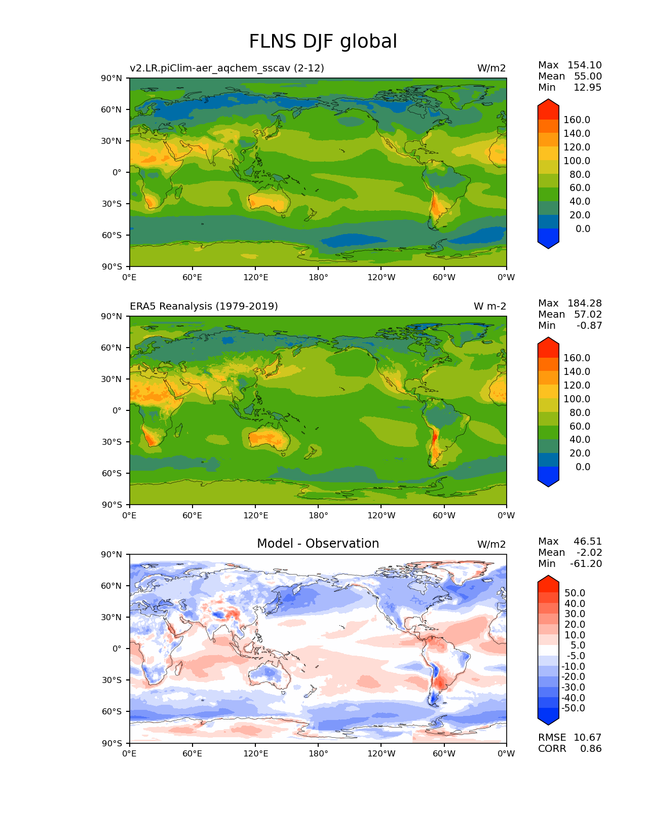 Use this command to recreate this image: | e3sm_diags lat_lon --no_viewer --case_id 'ERA5' --sets 'lat_lon' --run_type 'model_vs_obs' --variables 'FLNS' --seasons 'DJF' --regions 'global' --regrid_tool 'esmf' --regrid_method 'conservative' --main_title 'FLNS DJF global' --backend 'mpl' --output_format 'png' --canvas_size_w '1212' --canvas_size_h '1628' --figsize '8.5' '11.0' --dpi '150' --arrows --contour_levels '0' '20' '40' '60' '80' '100' '120' '140' '160' --test_name 'v2.LR.piClim-aer_oxid_sscav_tuning_off_reduced_so4_aqchem' --short_test_name 'v2.LR.piClim-aer_aqchem_sscav' --test_colormap 'cet_rainbow.rgb' --ref_name 'ERA5' --reference_name 'ERA5 Reanalysis' --reference_colormap 'cet_rainbow.rgb' --diff_title 'Model - Observation' --diff_colormap 'diverging_bwr.rgb' --diff_levels '-50' '-40' '-30' '-20' '-10' '-5' '5' '10' '20' '30' '40' '50' --multiprocessing --num_workers '32' --granulate 'variables' 'seasons' 'plevs' 'regions' --selectors 'sets' 'seasons' --reference_data_path '/global/cfs/cdirs/e3sm/acme_diags/obs_for_e3sm_diags/climatology/' --test_data_path '/global/cscratch1/sd/beydoun/E3SMv2/v2.LR.piClim-aer_oxid_sscav_tuning_off_reduced_so4_aqchem/run/climo/rgr' --results_dir '/global/cfs/cdirs/e3sm/www/beydoun/v2.LR.piClim-aer_aqchem_sscav' |