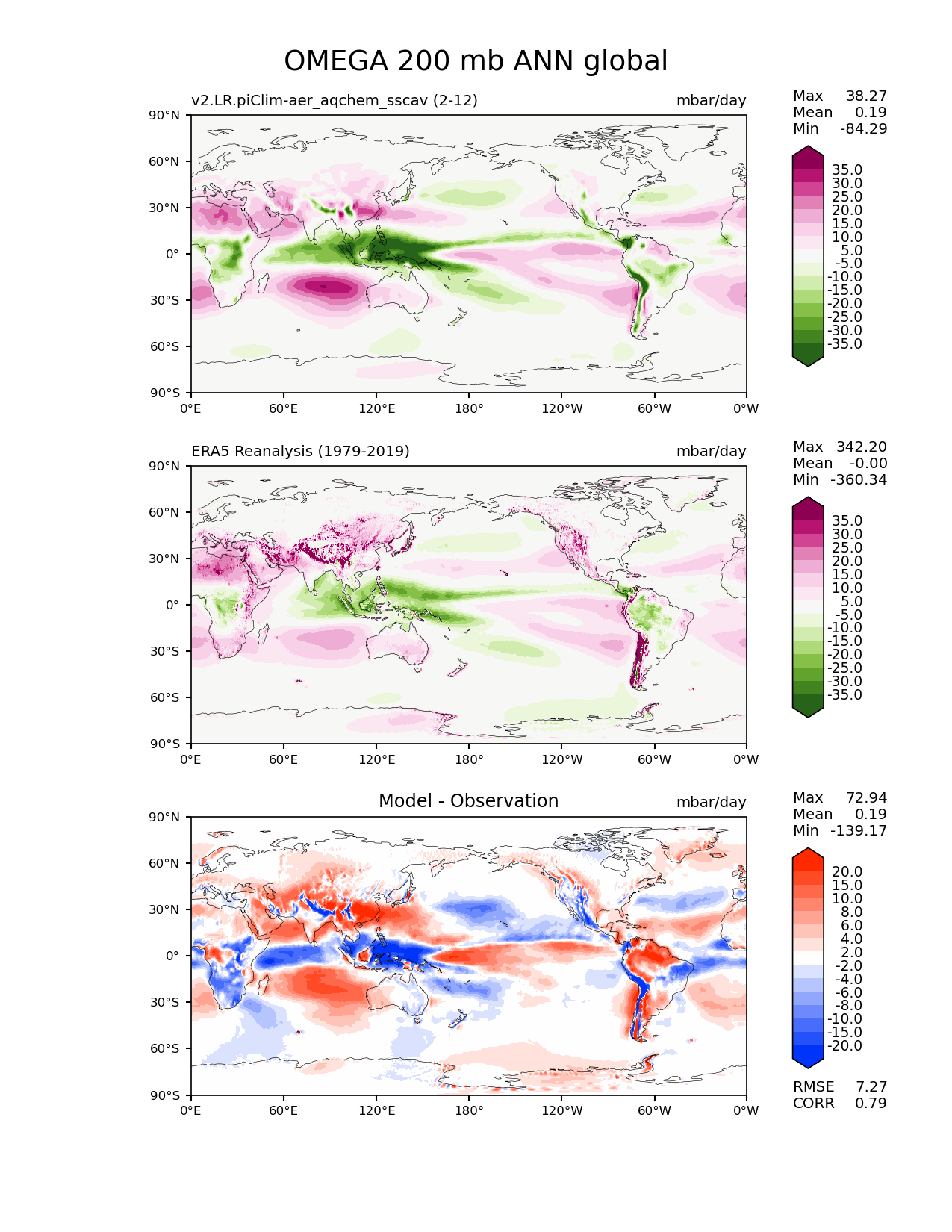 Use this command to recreate this image: | e3sm_diags lat_lon --no_viewer --case_id 'ERA5' --sets 'lat_lon' --run_type 'model_vs_obs' --variables 'OMEGA' --seasons 'ANN' --regions 'global' --regrid_tool 'esmf' --regrid_method 'conservative' --plevs '200.0' --main_title 'OMEGA 200 mb ANN global' --backend 'mpl' --output_format 'png' --canvas_size_w '1212' --canvas_size_h '1628' --figsize '8.5' '11.0' --dpi '150' --arrows --contour_levels '-35' '-30' '-25' '-20' '-15' '-10' '-5' '5' '10' '15' '20' '25' '30' '35' --test_name 'v2.LR.piClim-aer_oxid_sscav_tuning_off_reduced_so4_aqchem' --short_test_name 'v2.LR.piClim-aer_aqchem_sscav' --test_colormap 'PiYG_r' --ref_name 'ERA5' --reference_name 'ERA5 Reanalysis' --reference_colormap 'PiYG_r' --diff_title 'Model - Observation' --diff_colormap 'diverging_bwr.rgb' --diff_levels '-20' '-15' '-10' '-8' '-6' '-4' '-2' '2' '4' '6' '8' '10' '15' '20' --multiprocessing --num_workers '32' --granulate 'variables' 'seasons' 'plevs' 'regions' --selectors 'sets' 'seasons' --reference_data_path '/global/cfs/cdirs/e3sm/acme_diags/obs_for_e3sm_diags/climatology/' --test_data_path '/global/cscratch1/sd/beydoun/E3SMv2/v2.LR.piClim-aer_oxid_sscav_tuning_off_reduced_so4_aqchem/run/climo/rgr' --results_dir '/global/cfs/cdirs/e3sm/www/beydoun/v2.LR.piClim-aer_aqchem_sscav' |