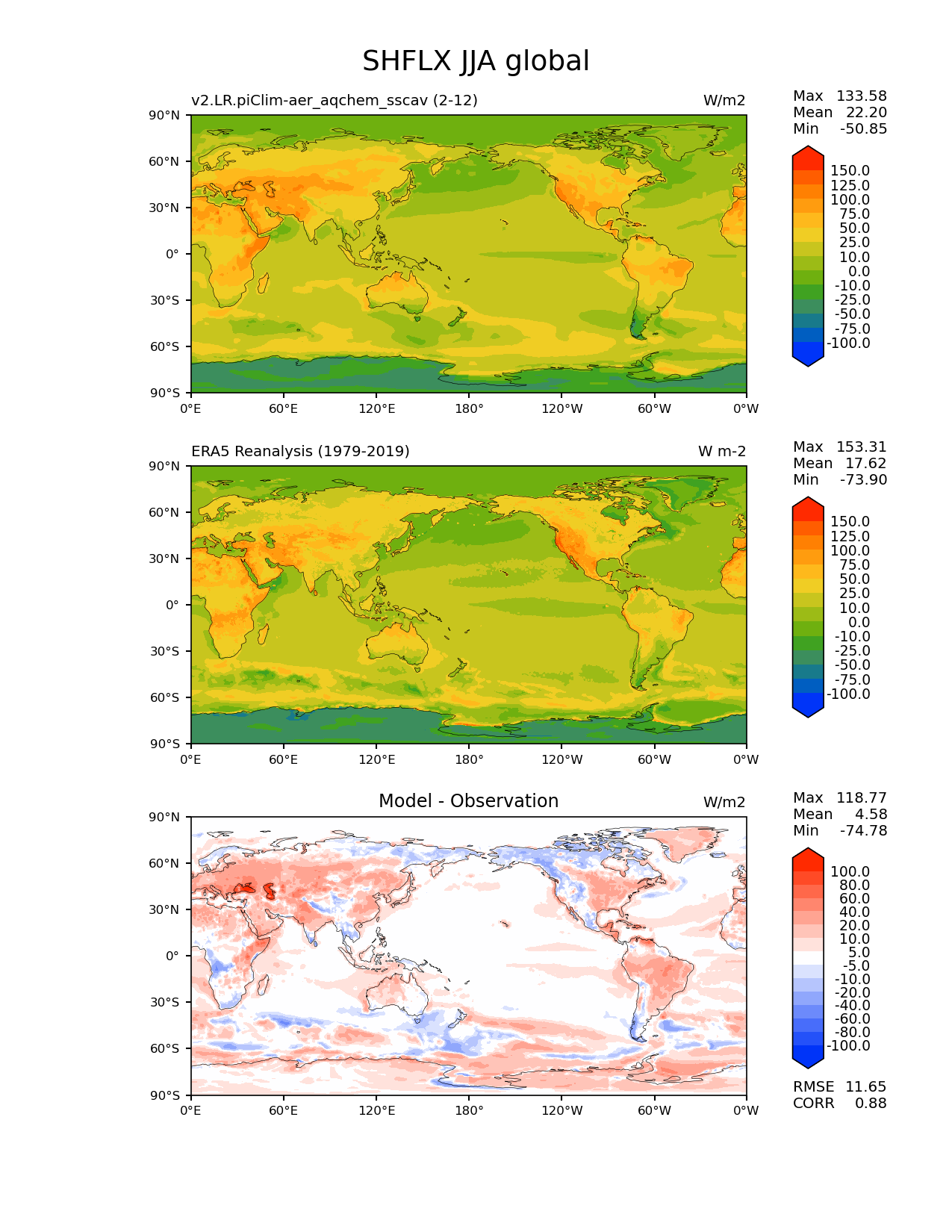Use this command to recreate this image: | e3sm_diags lat_lon --no_viewer --case_id 'ERA5' --sets 'lat_lon' --run_type 'model_vs_obs' --variables 'SHFLX' --seasons 'JJA' --regions 'global' --regrid_tool 'esmf' --regrid_method 'conservative' --main_title 'SHFLX JJA global' --backend 'mpl' --output_format 'png' --canvas_size_w '1212' --canvas_size_h '1628' --figsize '8.5' '11.0' --dpi '150' --arrows --contour_levels '-100' '-75' '-50' '-25' '-10' '0' '10' '25' '50' '75' '100' '125' '150' --test_name 'v2.LR.piClim-aer_oxid_sscav_tuning_off_reduced_so4_aqchem' --short_test_name 'v2.LR.piClim-aer_aqchem_sscav' --test_colormap 'cet_rainbow.rgb' --ref_name 'ERA5' --reference_name 'ERA5 Reanalysis' --reference_colormap 'cet_rainbow.rgb' --diff_title 'Model - Observation' --diff_colormap 'diverging_bwr.rgb' --diff_levels '-100' '-80' '-60' '-40' '-20' '-10' '-5' '5' '10' '20' '40' '60' '80' '100' --multiprocessing --num_workers '32' --granulate 'variables' 'seasons' 'plevs' 'regions' --selectors 'sets' 'seasons' --reference_data_path '/global/cfs/cdirs/e3sm/acme_diags/obs_for_e3sm_diags/climatology/' --test_data_path '/global/cscratch1/sd/beydoun/E3SMv2/v2.LR.piClim-aer_oxid_sscav_tuning_off_reduced_so4_aqchem/run/climo/rgr' --results_dir '/global/cfs/cdirs/e3sm/www/beydoun/v2.LR.piClim-aer_aqchem_sscav' |