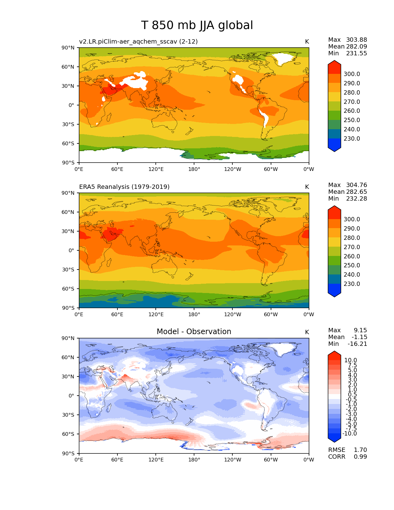 Use this command to recreate this image: | e3sm_diags lat_lon --no_viewer --case_id 'ERA5' --sets 'lat_lon' --run_type 'model_vs_obs' --variables 'T' --seasons 'JJA' --regions 'global' --regrid_tool 'esmf' --regrid_method 'bilinear' --plevs '850.0' --main_title 'T 850 mb JJA global' --backend 'mpl' --output_format 'png' --canvas_size_w '1212' --canvas_size_h '1628' --figsize '8.5' '11.0' --dpi '150' --arrows --contour_levels '230' '240' '250' '260' '270' '280' '290' '300' --test_name 'v2.LR.piClim-aer_oxid_sscav_tuning_off_reduced_so4_aqchem' --short_test_name 'v2.LR.piClim-aer_aqchem_sscav' --test_colormap 'cet_rainbow.rgb' --ref_name 'ERA5' --reference_name 'ERA5 Reanalysis' --reference_colormap 'cet_rainbow.rgb' --diff_title 'Model - Observation' --diff_colormap 'diverging_bwr.rgb' --diff_levels '-10' '-7.5' '-5' '-4' '-3' '-2' '-1' '-0.5' '0.5' '1' '2' '3' '4' '5' '7.5' '10' --multiprocessing --num_workers '32' --granulate 'variables' 'seasons' 'plevs' 'regions' --selectors 'sets' 'seasons' --reference_data_path '/global/cfs/cdirs/e3sm/acme_diags/obs_for_e3sm_diags/climatology/' --test_data_path '/global/cscratch1/sd/beydoun/E3SMv2/v2.LR.piClim-aer_oxid_sscav_tuning_off_reduced_so4_aqchem/run/climo/rgr' --results_dir '/global/cfs/cdirs/e3sm/www/beydoun/v2.LR.piClim-aer_aqchem_sscav' |