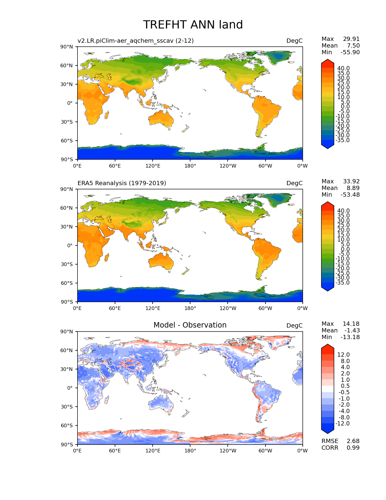 Use this command to recreate this image: | e3sm_diags lat_lon --no_viewer --case_id 'ERA5' --sets 'lat_lon' --run_type 'model_vs_obs' --variables 'TREFHT' --seasons 'ANN' --regions 'land' --regrid_tool 'esmf' --regrid_method 'bilinear' --main_title 'TREFHT ANN land' --backend 'mpl' --output_format 'png' --canvas_size_w '1212' --canvas_size_h '1628' --figsize '8.5' '11.0' --dpi '150' --arrows --contour_levels '-35' '-30' '-25' '-20' '-15' '-10' '-5' '0' '5' '10' '15' '20' '25' '30' '35' '40' --test_name 'v2.LR.piClim-aer_oxid_sscav_tuning_off_reduced_so4_aqchem' --short_test_name 'v2.LR.piClim-aer_aqchem_sscav' --test_colormap 'cet_rainbow.rgb' --ref_name 'ERA5' --reference_name 'ERA5 Reanalysis' --reference_colormap 'cet_rainbow.rgb' --diff_title 'Model - Observation' --diff_colormap 'diverging_bwr.rgb' --diff_levels '-12' '-8' '-4' '-2' '-1' '-0.5' '0.5' '1' '2' '4' '8' '12' --multiprocessing --num_workers '32' --granulate 'variables' 'seasons' 'plevs' 'regions' --selectors 'sets' 'seasons' --reference_data_path '/global/cfs/cdirs/e3sm/acme_diags/obs_for_e3sm_diags/climatology/' --test_data_path '/global/cscratch1/sd/beydoun/E3SMv2/v2.LR.piClim-aer_oxid_sscav_tuning_off_reduced_so4_aqchem/run/climo/rgr' --results_dir '/global/cfs/cdirs/e3sm/www/beydoun/v2.LR.piClim-aer_aqchem_sscav' |