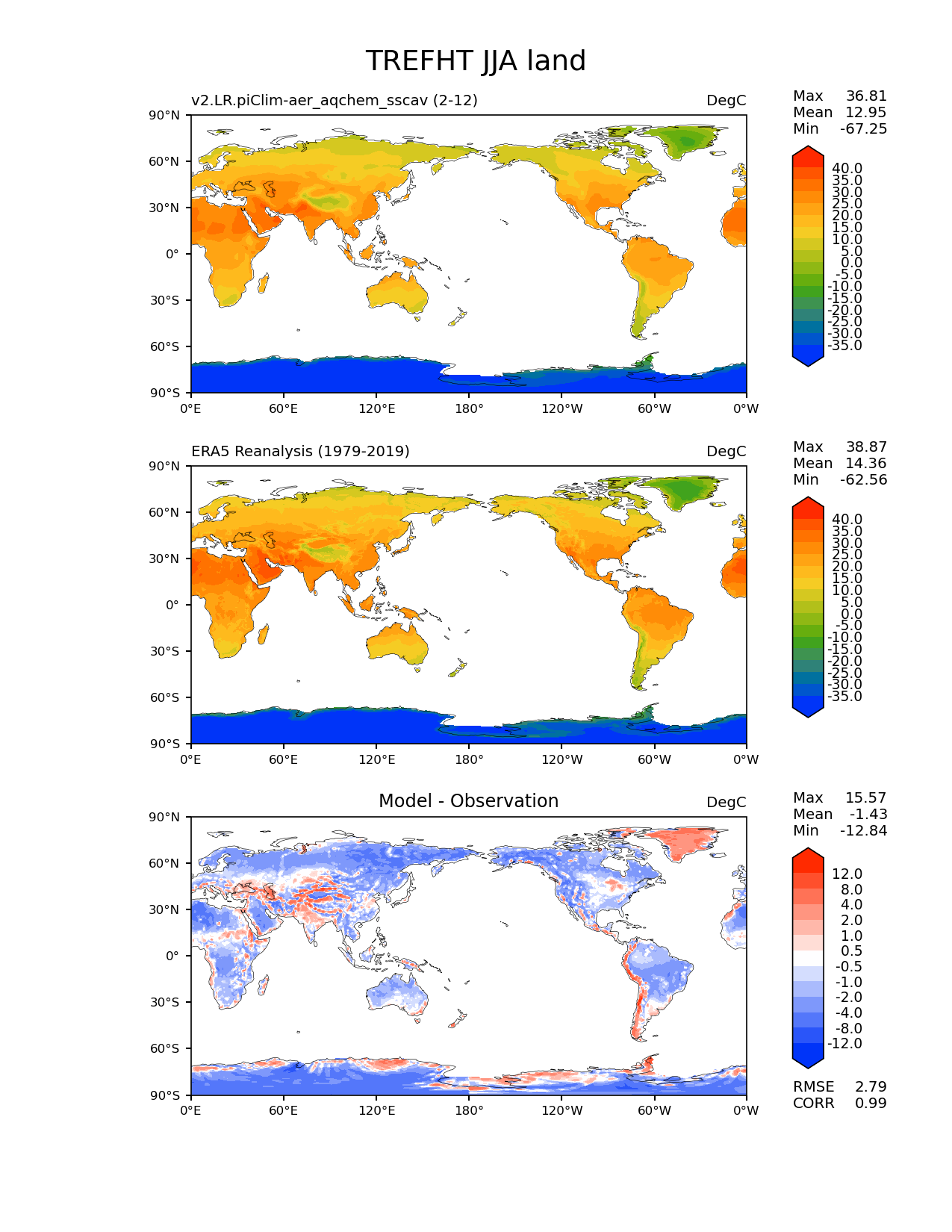 Use this command to recreate this image: | e3sm_diags lat_lon --no_viewer --case_id 'ERA5' --sets 'lat_lon' --run_type 'model_vs_obs' --variables 'TREFHT' --seasons 'JJA' --regions 'land' --regrid_tool 'esmf' --regrid_method 'bilinear' --main_title 'TREFHT JJA land' --backend 'mpl' --output_format 'png' --canvas_size_w '1212' --canvas_size_h '1628' --figsize '8.5' '11.0' --dpi '150' --arrows --contour_levels '-35' '-30' '-25' '-20' '-15' '-10' '-5' '0' '5' '10' '15' '20' '25' '30' '35' '40' --test_name 'v2.LR.piClim-aer_oxid_sscav_tuning_off_reduced_so4_aqchem' --short_test_name 'v2.LR.piClim-aer_aqchem_sscav' --test_colormap 'cet_rainbow.rgb' --ref_name 'ERA5' --reference_name 'ERA5 Reanalysis' --reference_colormap 'cet_rainbow.rgb' --diff_title 'Model - Observation' --diff_colormap 'diverging_bwr.rgb' --diff_levels '-12' '-8' '-4' '-2' '-1' '-0.5' '0.5' '1' '2' '4' '8' '12' --multiprocessing --num_workers '32' --granulate 'variables' 'seasons' 'plevs' 'regions' --selectors 'sets' 'seasons' --reference_data_path '/global/cfs/cdirs/e3sm/acme_diags/obs_for_e3sm_diags/climatology/' --test_data_path '/global/cscratch1/sd/beydoun/E3SMv2/v2.LR.piClim-aer_oxid_sscav_tuning_off_reduced_so4_aqchem/run/climo/rgr' --results_dir '/global/cfs/cdirs/e3sm/www/beydoun/v2.LR.piClim-aer_aqchem_sscav' |