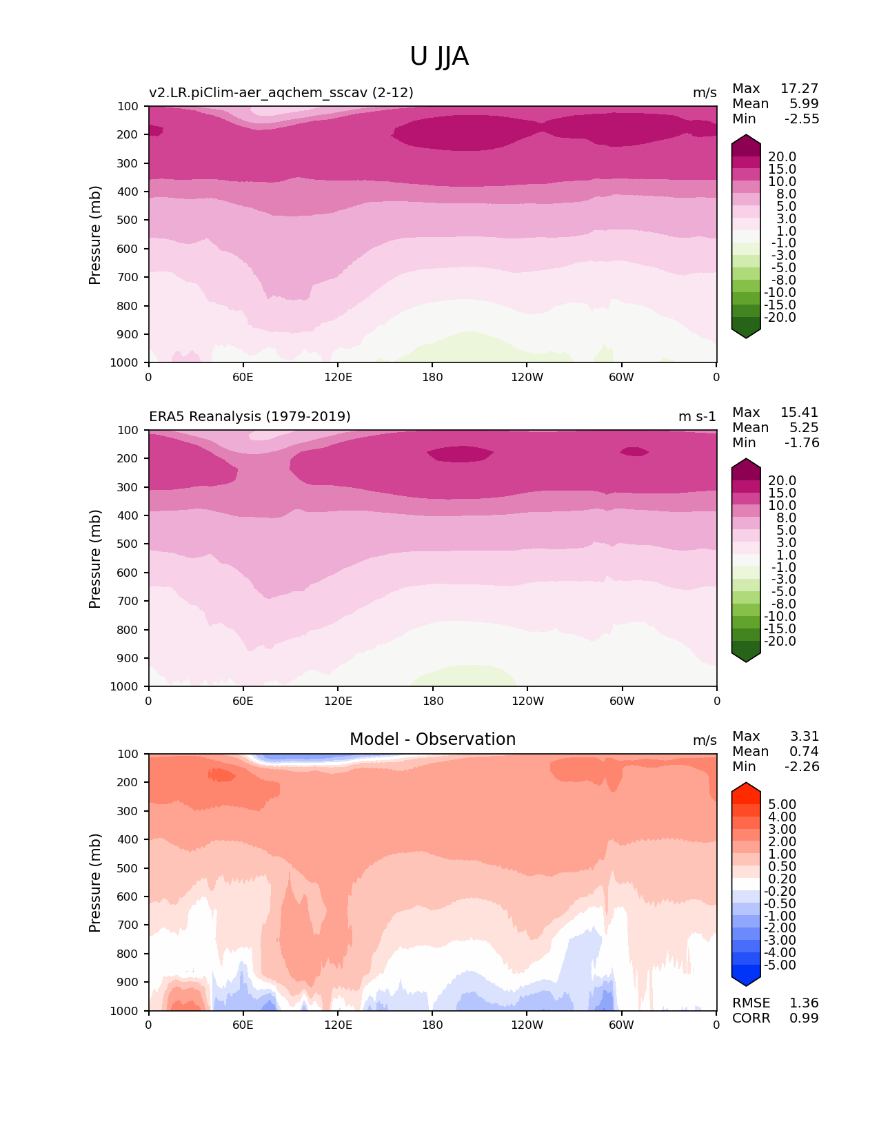 Use this command to recreate this image: | e3sm_diags meridional_mean_2d --no_viewer --case_id 'ERA5' --sets 'meridional_mean_2d' --run_type 'model_vs_obs' --variables 'U' --seasons 'JJA' --regions 'global' --regrid_tool 'esmf' --regrid_method 'conservative' --plevs '100.0' '115.47819846894582' '133.3521432163324' '153.9926526059492' '177.82794100389228' '205.3525026457146' '237.13737056616552' '273.8419634264361' '316.22776601683796' '365.1741272548377' '421.6965034285823' '486.9675251658631' '562.341325190349' '649.3816315762114' '749.8942093324558' '865.9643233600654' '1000.0' --main_title 'U JJA' --backend 'mpl' --output_format 'png' --canvas_size_w '1212' --canvas_size_h '1628' --figsize '8.5' '11.0' --dpi '150' --arrows --contour_levels '-20' '-15' '-10' '-8' '-5' '-3' '-1' '1' '3' '5' '8' '10' '15' '20' --test_name 'v2.LR.piClim-aer_oxid_sscav_tuning_off_reduced_so4_aqchem' --short_test_name 'v2.LR.piClim-aer_aqchem_sscav' --test_colormap 'PiYG_r' --ref_name 'ERA5' --reference_name 'ERA5 Reanalysis' --reference_colormap 'PiYG_r' --diff_title 'Model - Observation' --diff_colormap 'diverging_bwr.rgb' --diff_levels '-5' '-4' '-3' '-2' '-1' '-0.5' '-0.2' '0.2' '0.5' '1' '2' '3' '4' '5' --multiprocessing --num_workers '32' --granulate 'variables' 'seasons' 'regions' --selectors 'sets' 'seasons' --reference_data_path '/global/cfs/cdirs/e3sm/acme_diags/obs_for_e3sm_diags/climatology/' --test_data_path '/global/cscratch1/sd/beydoun/E3SMv2/v2.LR.piClim-aer_oxid_sscav_tuning_off_reduced_so4_aqchem/run/climo/rgr' --results_dir '/global/cfs/cdirs/e3sm/www/beydoun/v2.LR.piClim-aer_aqchem_sscav' |