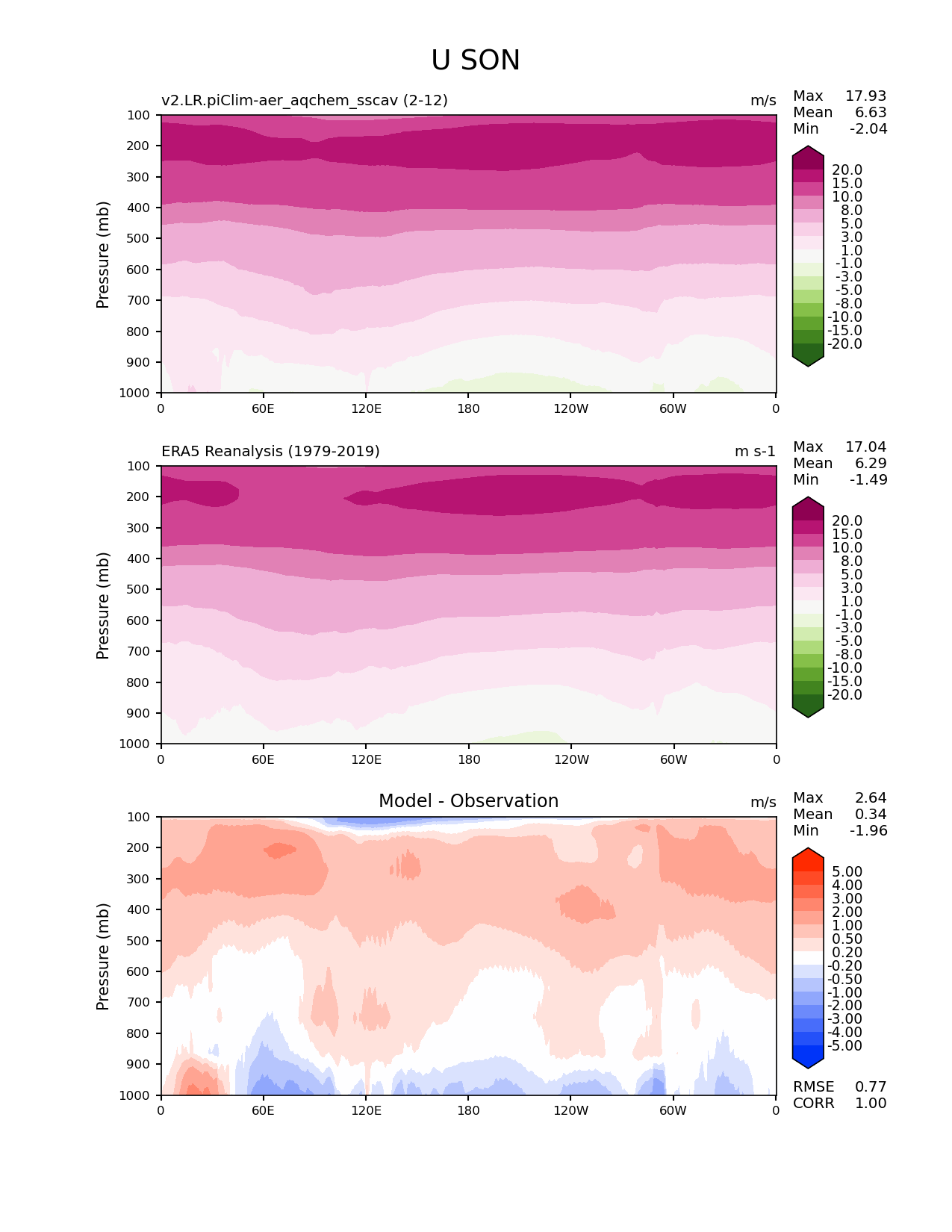 Use this command to recreate this image: | e3sm_diags meridional_mean_2d --no_viewer --case_id 'ERA5' --sets 'meridional_mean_2d' --run_type 'model_vs_obs' --variables 'U' --seasons 'SON' --regions 'global' --regrid_tool 'esmf' --regrid_method 'conservative' --plevs '100.0' '115.47819846894582' '133.3521432163324' '153.9926526059492' '177.82794100389228' '205.3525026457146' '237.13737056616552' '273.8419634264361' '316.22776601683796' '365.1741272548377' '421.6965034285823' '486.9675251658631' '562.341325190349' '649.3816315762114' '749.8942093324558' '865.9643233600654' '1000.0' --main_title 'U SON' --backend 'mpl' --output_format 'png' --canvas_size_w '1212' --canvas_size_h '1628' --figsize '8.5' '11.0' --dpi '150' --arrows --contour_levels '-20' '-15' '-10' '-8' '-5' '-3' '-1' '1' '3' '5' '8' '10' '15' '20' --test_name 'v2.LR.piClim-aer_oxid_sscav_tuning_off_reduced_so4_aqchem' --short_test_name 'v2.LR.piClim-aer_aqchem_sscav' --test_colormap 'PiYG_r' --ref_name 'ERA5' --reference_name 'ERA5 Reanalysis' --reference_colormap 'PiYG_r' --diff_title 'Model - Observation' --diff_colormap 'diverging_bwr.rgb' --diff_levels '-5' '-4' '-3' '-2' '-1' '-0.5' '-0.2' '0.2' '0.5' '1' '2' '3' '4' '5' --multiprocessing --num_workers '32' --granulate 'variables' 'seasons' 'regions' --selectors 'sets' 'seasons' --reference_data_path '/global/cfs/cdirs/e3sm/acme_diags/obs_for_e3sm_diags/climatology/' --test_data_path '/global/cscratch1/sd/beydoun/E3SMv2/v2.LR.piClim-aer_oxid_sscav_tuning_off_reduced_so4_aqchem/run/climo/rgr' --results_dir '/global/cfs/cdirs/e3sm/www/beydoun/v2.LR.piClim-aer_aqchem_sscav' |