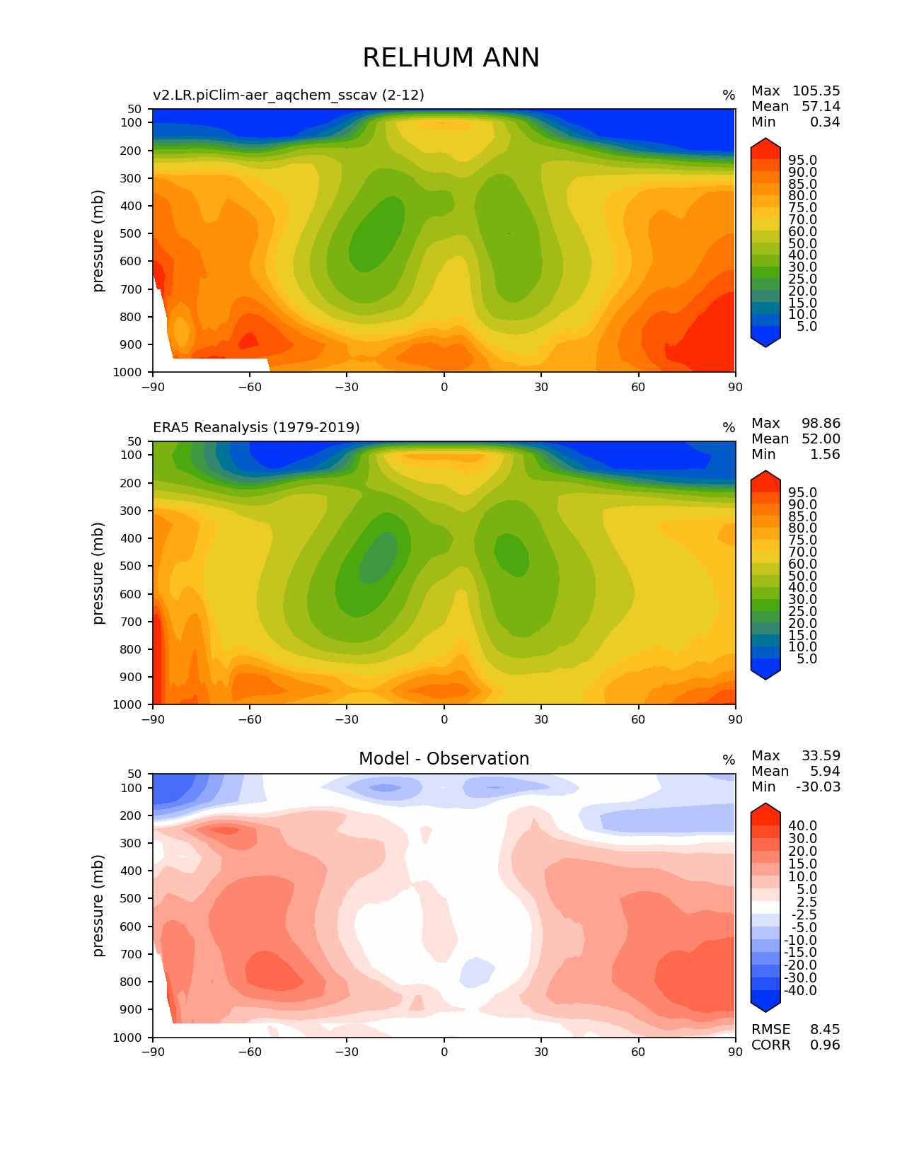 Use this command to recreate this image: | e3sm_diags zonal_mean_2d --no_viewer --case_id 'ERA5' --sets 'zonal_mean_2d' --run_type 'model_vs_obs' --variables 'RELHUM' --seasons 'ANN' --regions 'global' --regrid_tool 'esmf' --regrid_method 'conservative' --plevs '50.0' '100.0' '150.0' '200.0' '250.0' '300.0' '350.0' '400.0' '450.0' '500.0' '550.0' '600.0' '650.0' '700.0' '750.0' '800.0' '850.0' '900.0' '950.0' '1000.0' --main_title 'RELHUM ANN' --backend 'mpl' --output_format 'png' --canvas_size_w '1212' --canvas_size_h '1628' --figsize '8.5' '11.0' --dpi '150' --arrows --contour_levels '5' '10' '15' '20' '25' '30' '40' '50' '60' '70' '75' '80' '85' '90' '95' --test_name 'v2.LR.piClim-aer_oxid_sscav_tuning_off_reduced_so4_aqchem' --short_test_name 'v2.LR.piClim-aer_aqchem_sscav' --test_colormap 'cet_rainbow.rgb' --ref_name 'ERA5' --reference_name 'ERA5 Reanalysis' --reference_colormap 'cet_rainbow.rgb' --diff_title 'Model - Observation' --diff_colormap 'diverging_bwr.rgb' --diff_levels '-40' '-30' '-20' '-15' '-10' '-5' '-2.5' '2.5' '5' '10' '15' '20' '30' '40' --multiprocessing --num_workers '32' --granulate 'variables' 'seasons' 'regions' --selectors 'sets' 'seasons' --reference_data_path '/global/cfs/cdirs/e3sm/acme_diags/obs_for_e3sm_diags/climatology/' --test_data_path '/global/cscratch1/sd/beydoun/E3SMv2/v2.LR.piClim-aer_oxid_sscav_tuning_off_reduced_so4_aqchem/run/climo/rgr' --results_dir '/global/cfs/cdirs/e3sm/www/beydoun/v2.LR.piClim-aer_aqchem_sscav' |