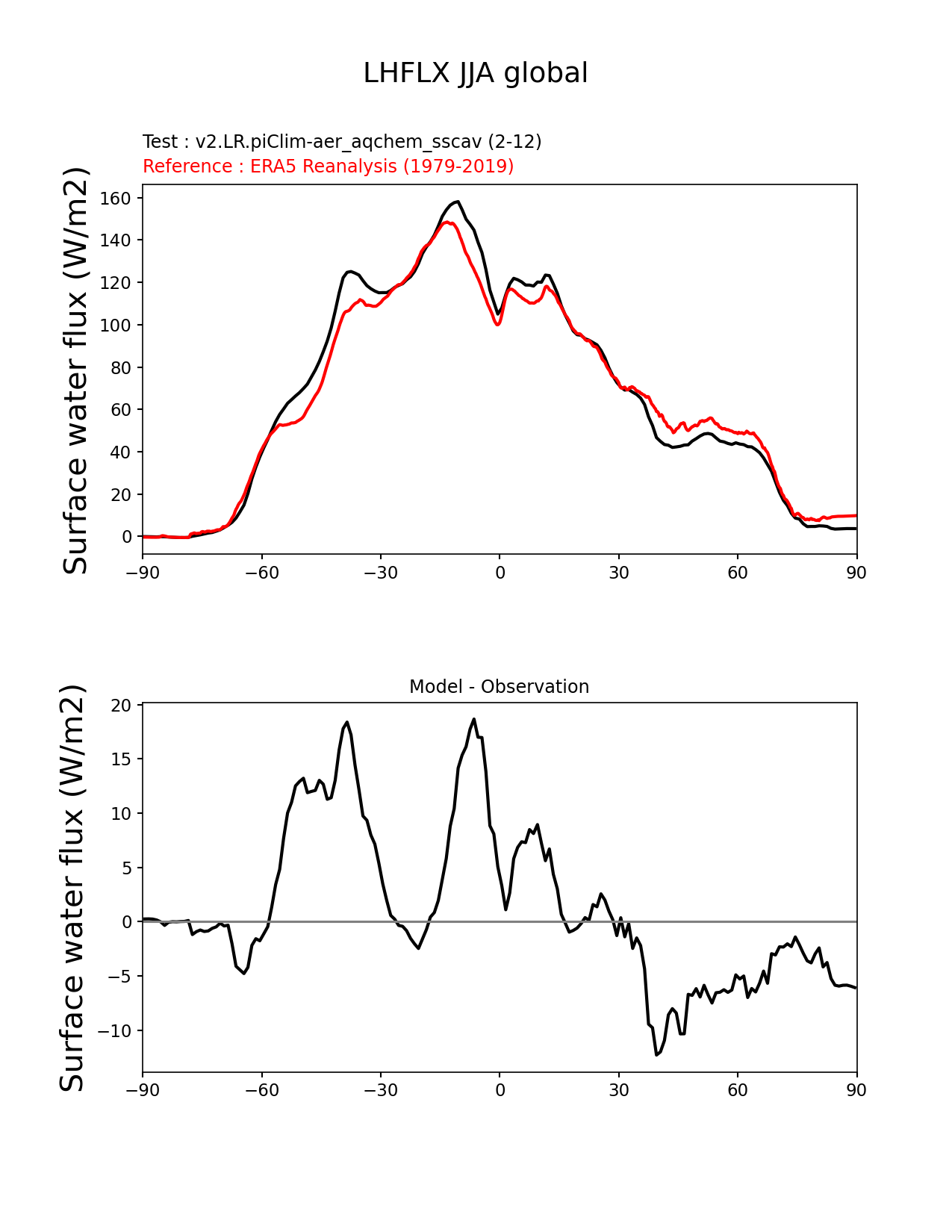 Use this command to recreate this image: | e3sm_diags zonal_mean_xy --no_viewer --case_id 'ERA5' --sets 'zonal_mean_xy' --run_type 'model_vs_obs' --variables 'LHFLX' --seasons 'JJA' --regions 'global' --regrid_tool 'esmf' --regrid_method 'conservative' --main_title 'LHFLX JJA global' --backend 'mpl' --output_format 'png' --canvas_size_w '1212' --canvas_size_h '1628' --figsize '8.5' '11.0' --dpi '150' --arrows --test_name 'v2.LR.piClim-aer_oxid_sscav_tuning_off_reduced_so4_aqchem' --short_test_name 'v2.LR.piClim-aer_aqchem_sscav' --test_colormap 'cet_rainbow.rgb' --ref_name 'ERA5' --reference_name 'ERA5 Reanalysis' --reference_colormap 'cet_rainbow.rgb' --diff_title 'Model - Observation' --diff_colormap 'diverging_bwr.rgb' --multiprocessing --num_workers '32' --granulate 'variables' 'seasons' 'plevs' 'regions' --selectors 'sets' 'seasons' --reference_data_path '/global/cfs/cdirs/e3sm/acme_diags/obs_for_e3sm_diags/climatology/' --test_data_path '/global/cscratch1/sd/beydoun/E3SMv2/v2.LR.piClim-aer_oxid_sscav_tuning_off_reduced_so4_aqchem/run/climo/rgr' --results_dir '/global/cfs/cdirs/e3sm/www/beydoun/v2.LR.piClim-aer_aqchem_sscav' |