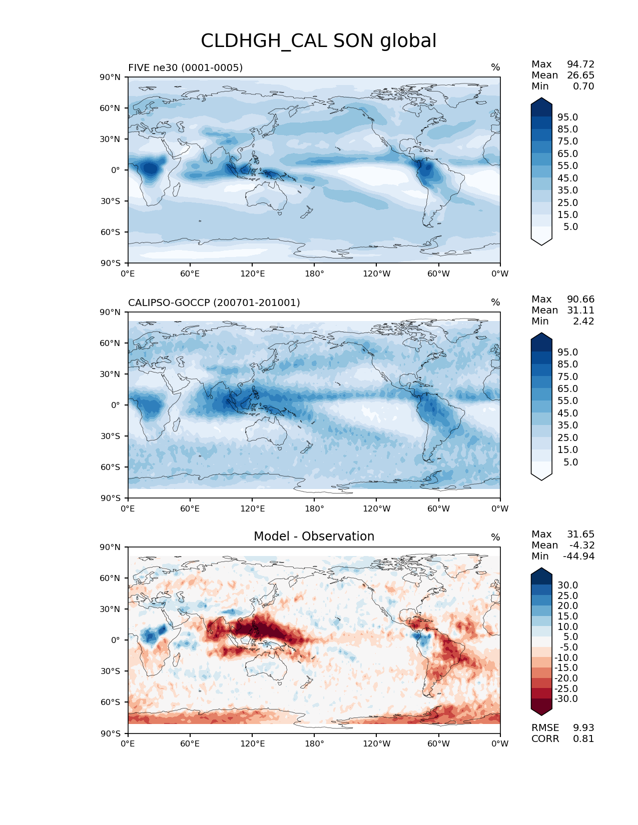 Use this command to recreate this image: | e3sm_diags lat_lon --no_viewer --case_id 'Cloud Calipso' --sets 'lat_lon' --run_type 'model_vs_obs' --variables 'CLDHGH_CAL' --seasons 'SON' --regions 'global' --regrid_tool 'esmf' --regrid_method 'conservative' --main_title 'CLDHGH_CAL SON global' --backend 'mpl' --output_format 'png' --canvas_size_w '1212' --canvas_size_h '1628' --figsize '8.5' '11.0' --dpi '150' --arrows --contour_levels '5' '15' '25' '35' '45' '55' '65' '75' '85' '95' --test_name 'E3SM_01212020_master.FIVELSv2L7.001f.ne30_ne30.syrah' --short_test_name 'FIVE ne30' --test_colormap 'Blues' --ref_name 'CALIPSOCOSP' --reference_name 'CALIPSO-GOCCP' --reference_colormap 'Blues' --diff_title 'Model - Observation' --diff_colormap 'RdBu' --diff_levels '-30' '-25' '-20' '-15' '-10' '-5' '5' '10' '15' '20' '25' '30' --multiprocessing --num_workers '32' --granulate 'variables' 'seasons' 'plevs' 'regions' --selectors 'sets' 'seasons' --reference_data_path '/global/cfs/cdirs/e3sm/acme_diags/obs_for_e3sm_diags/climatology/' --test_data_path '/global/cscratch1/sd/bogensch/E3SM_simulations/climofiles/E3SM_01212020_master.FIVELSv2L7.001f.ne30_ne30.syrah' --results_dir '/global/cfs/cdirs/e3sm/www/bogensch/RRM_diags/E3SM_01212020_master.FIVELSv2L7.001f.ne30_ne30.syrah' |