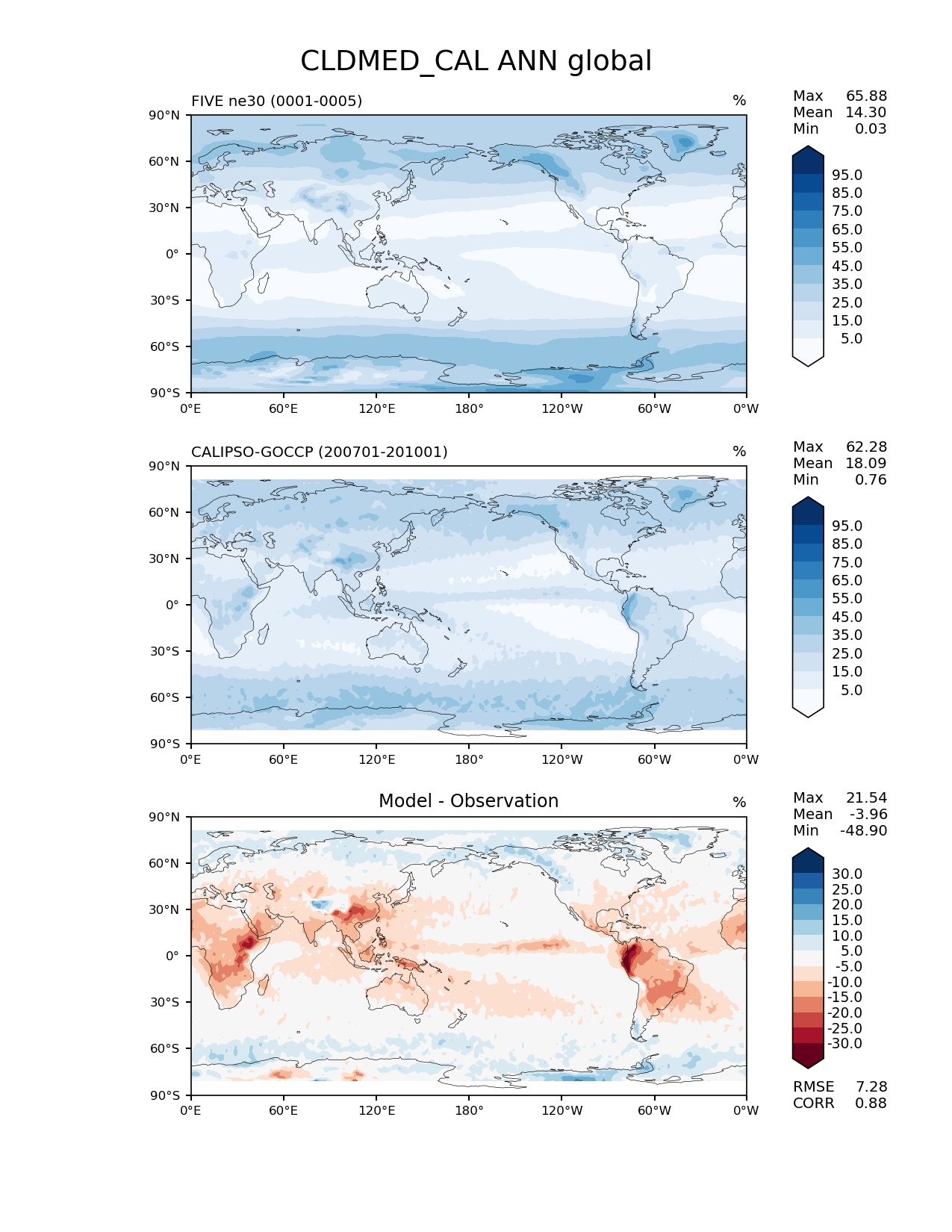 Use this command to recreate this image: | e3sm_diags lat_lon --no_viewer --case_id 'Cloud Calipso' --sets 'lat_lon' --run_type 'model_vs_obs' --variables 'CLDMED_CAL' --seasons 'ANN' --regions 'global' --regrid_tool 'esmf' --regrid_method 'conservative' --main_title 'CLDMED_CAL ANN global' --backend 'mpl' --output_format 'png' --canvas_size_w '1212' --canvas_size_h '1628' --figsize '8.5' '11.0' --dpi '150' --arrows --contour_levels '5' '15' '25' '35' '45' '55' '65' '75' '85' '95' --test_name 'E3SM_01212020_master.FIVELSv2L7.001f.ne30_ne30.syrah' --short_test_name 'FIVE ne30' --test_colormap 'Blues' --ref_name 'CALIPSOCOSP' --reference_name 'CALIPSO-GOCCP' --reference_colormap 'Blues' --diff_title 'Model - Observation' --diff_colormap 'RdBu' --diff_levels '-30' '-25' '-20' '-15' '-10' '-5' '5' '10' '15' '20' '25' '30' --multiprocessing --num_workers '32' --granulate 'variables' 'seasons' 'plevs' 'regions' --selectors 'sets' 'seasons' --reference_data_path '/global/cfs/cdirs/e3sm/acme_diags/obs_for_e3sm_diags/climatology/' --test_data_path '/global/cscratch1/sd/bogensch/E3SM_simulations/climofiles/E3SM_01212020_master.FIVELSv2L7.001f.ne30_ne30.syrah' --results_dir '/global/cfs/cdirs/e3sm/www/bogensch/RRM_diags/E3SM_01212020_master.FIVELSv2L7.001f.ne30_ne30.syrah' |