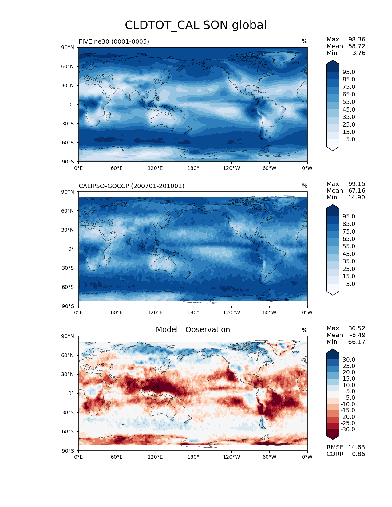 Use this command to recreate this image: | e3sm_diags lat_lon --no_viewer --case_id 'Cloud Calipso' --sets 'lat_lon' --run_type 'model_vs_obs' --variables 'CLDTOT_CAL' --seasons 'SON' --regions 'global' --regrid_tool 'esmf' --regrid_method 'conservative' --main_title 'CLDTOT_CAL SON global' --backend 'mpl' --output_format 'png' --canvas_size_w '1212' --canvas_size_h '1628' --figsize '8.5' '11.0' --dpi '150' --arrows --contour_levels '5' '15' '25' '35' '45' '55' '65' '75' '85' '95' --test_name 'E3SM_01212020_master.FIVELSv2L7.001f.ne30_ne30.syrah' --short_test_name 'FIVE ne30' --test_colormap 'Blues' --ref_name 'CALIPSOCOSP' --reference_name 'CALIPSO-GOCCP' --reference_colormap 'Blues' --diff_title 'Model - Observation' --diff_colormap 'RdBu' --diff_levels '-30' '-25' '-20' '-15' '-10' '-5' '5' '10' '15' '20' '25' '30' --multiprocessing --num_workers '32' --granulate 'variables' 'seasons' 'plevs' 'regions' --selectors 'sets' 'seasons' --reference_data_path '/global/cfs/cdirs/e3sm/acme_diags/obs_for_e3sm_diags/climatology/' --test_data_path '/global/cscratch1/sd/bogensch/E3SM_simulations/climofiles/E3SM_01212020_master.FIVELSv2L7.001f.ne30_ne30.syrah' --results_dir '/global/cfs/cdirs/e3sm/www/bogensch/RRM_diags/E3SM_01212020_master.FIVELSv2L7.001f.ne30_ne30.syrah' |