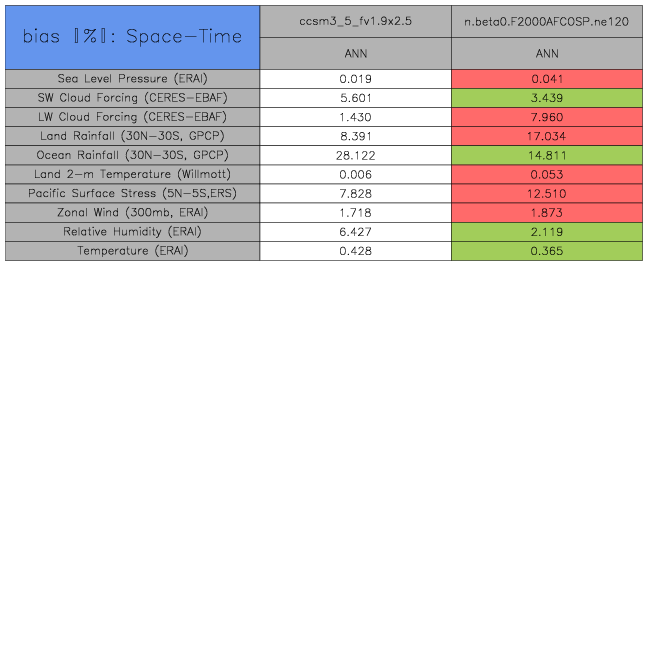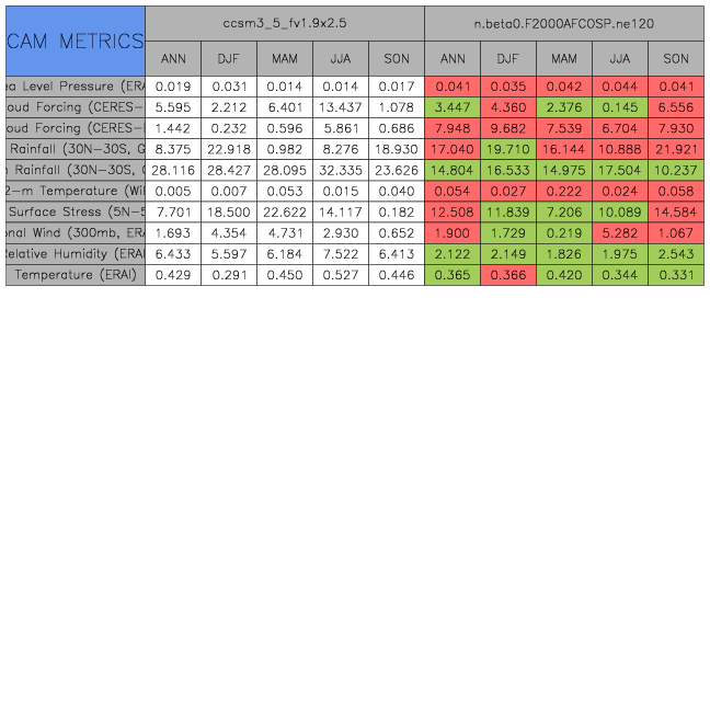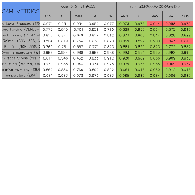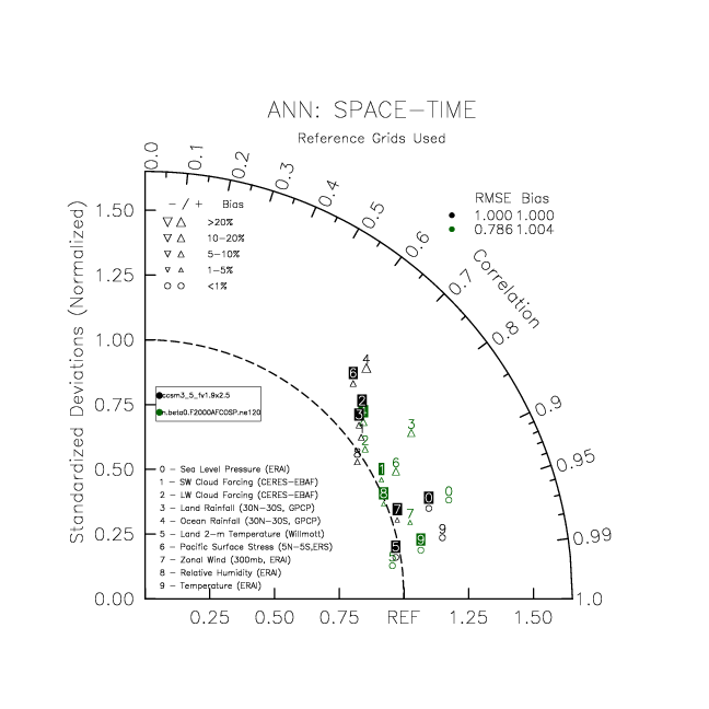 Taylor Diagrams were developed by Karl Taylor at PCMDI (paper|tech note) and aim to condense information about variance and RMSE characteristics of a particular model run when compared with observations in a single diagram. The tables summarize the individual metrics for each variable considered including: