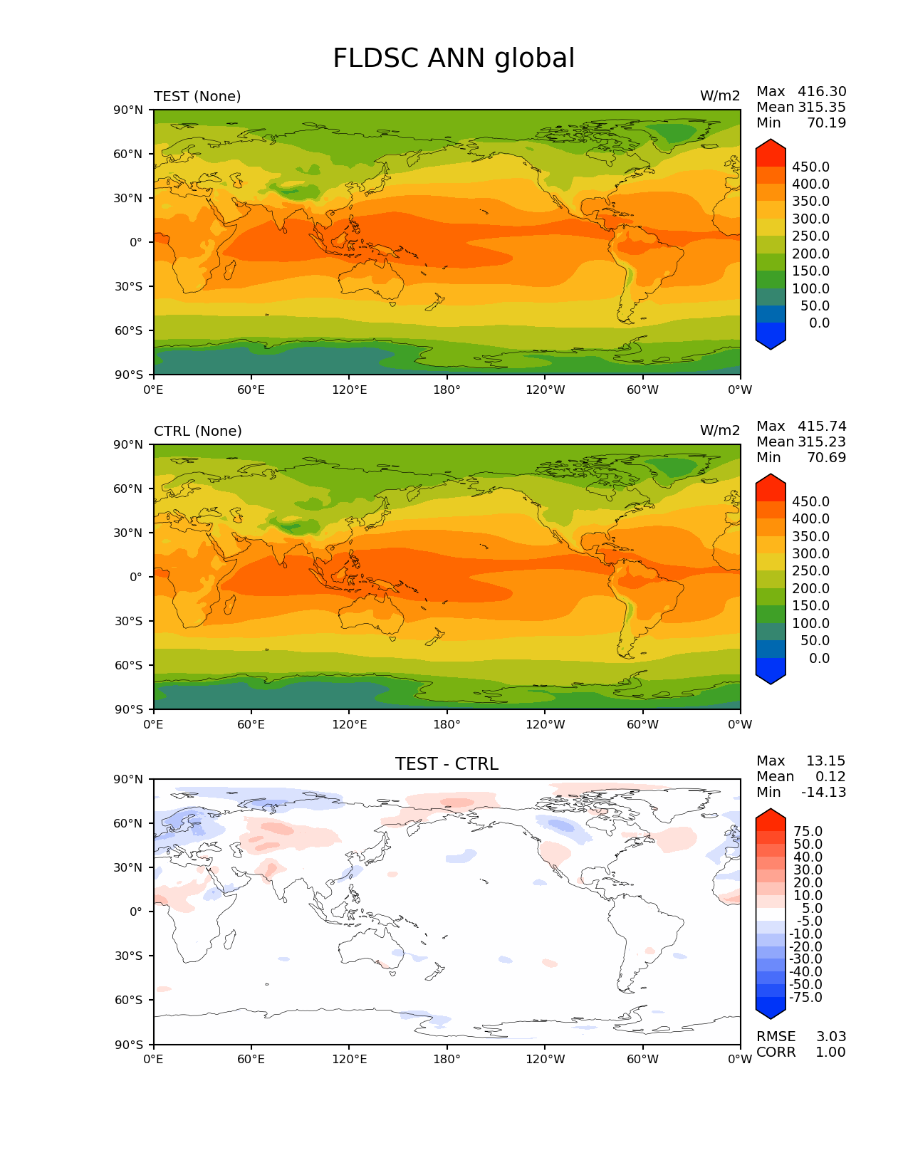 Use this command to recreate this image: | e3sm_diags lat_lon --no_viewer --sets 'lat_lon' --case_id 'MAM4_test_ctrl' --variables 'FLDSC' --seasons 'ANN' --contour_levels '0' '50' '100' '150' '200' '250' '300' '350' '400' '450' --diff_levels '-75' '-50' '-40' '-30' '-20' '-10' '-5' '5' '10' '20' '30' '40' '50' '75' --run_type 'model_vs_model' --regions 'global' --regrid_tool 'esmf' --regrid_method 'conservative' --main_title 'FLDSC ANN global' --backend 'mpl' --output_format 'png' --canvas_size_w '1212' --canvas_size_h '1628' --figsize '8.5' '11.0' --dpi '150' --arrows --test_name 'E3SM_MAM4_test2' --short_test_name 'TEST' --test_colormap 'cet_rainbow.rgb' --ref_name 'E3SM_MAM4_control' --reference_colormap 'cet_rainbow.rgb' --diff_title 'TEST - CTRL' --diff_colormap 'diverging_bwr.rgb' --multiprocessing --num_workers '32' --granulate 'variables' 'seasons' 'plevs' 'regions' --selectors 'sets' 'seasons' --reference_data_path '/global/cscratch1/sd/gxlin/MMF_regrid_data/E3SM_MAM4_control/climo_outdir/' --results_dir '/global/project/projectdirs/e3sm/www/gxlin/' --test_data_path '/global/cscratch1/sd/gxlin/MMF_regrid_data/E3SM_MAM4_test/climo_outdir/' |