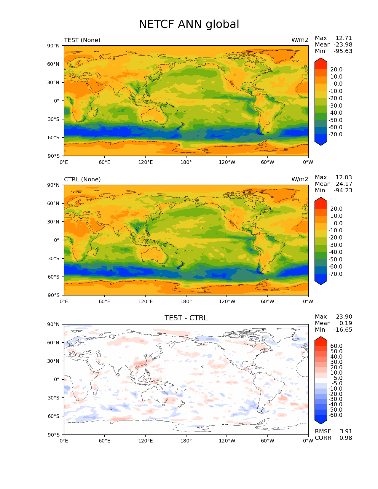 Use this command to recreate this image: | e3sm_diags lat_lon --no_viewer --sets 'lat_lon' --case_id 'MAM4_test_ctrl' --variables 'NETCF' --seasons 'ANN' --contour_levels '-70' '-60' '-50' '-40' '-30' '-20' '-10' '0' '10' '20' --diff_levels '-60' '-50' '-40' '-30' '-20' '-10' '-5' '5' '10' '20' '30' '40' '50' '60' --run_type 'model_vs_model' --regions 'global' --regrid_tool 'esmf' --regrid_method 'conservative' --main_title 'NETCF ANN global' --backend 'mpl' --output_format 'png' --canvas_size_w '1212' --canvas_size_h '1628' --figsize '8.5' '11.0' --dpi '150' --arrows --test_name 'E3SM_MAM4_test2' --short_test_name 'TEST' --test_colormap 'cet_rainbow.rgb' --ref_name 'E3SM_MAM4_control' --reference_colormap 'cet_rainbow.rgb' --diff_title 'TEST - CTRL' --diff_colormap 'diverging_bwr.rgb' --multiprocessing --num_workers '32' --granulate 'variables' 'seasons' 'plevs' 'regions' --selectors 'sets' 'seasons' --reference_data_path '/global/cscratch1/sd/gxlin/MMF_regrid_data/E3SM_MAM4_control/climo_outdir/' --results_dir '/global/project/projectdirs/e3sm/www/gxlin/' --test_data_path '/global/cscratch1/sd/gxlin/MMF_regrid_data/E3SM_MAM4_test/climo_outdir/' |