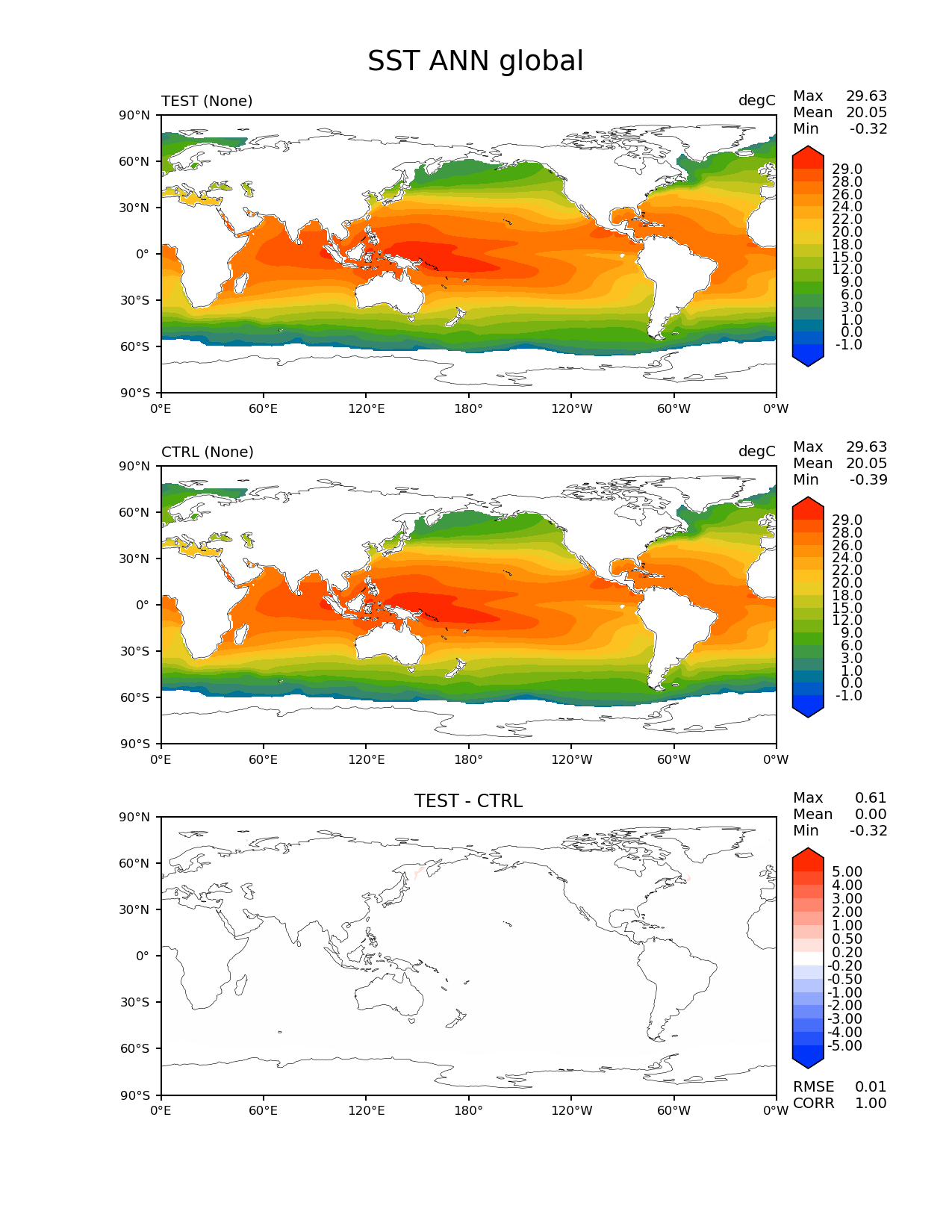 Use this command to recreate this image: | e3sm_diags lat_lon --no_viewer --sets 'lat_lon' --case_id 'MAM4_test_ctrl' --variables 'SST' --seasons 'ANN' --contour_levels '-1' '0' '1' '3' '6' '9' '12' '15' '18' '20' '22' '24' '26' '28' '29' --diff_levels '-5' '-4' '-3' '-2' '-1' '-0.5' '-0.2' '0.2' '0.5' '1' '2' '3' '4' '5' --run_type 'model_vs_model' --regions 'global' --regrid_tool 'esmf' --regrid_method 'conservative' --main_title 'SST ANN global' --backend 'mpl' --output_format 'png' --canvas_size_w '1212' --canvas_size_h '1628' --figsize '8.5' '11.0' --dpi '150' --arrows --test_name 'E3SM_MAM4_test2' --short_test_name 'TEST' --test_colormap 'cet_rainbow.rgb' --ref_name 'E3SM_MAM4_control' --reference_colormap 'cet_rainbow.rgb' --diff_title 'TEST - CTRL' --diff_colormap 'diverging_bwr.rgb' --multiprocessing --num_workers '32' --granulate 'variables' 'seasons' 'plevs' 'regions' --selectors 'sets' 'seasons' --reference_data_path '/global/cscratch1/sd/gxlin/MMF_regrid_data/E3SM_MAM4_control/climo_outdir/' --results_dir '/global/project/projectdirs/e3sm/www/gxlin/' --test_data_path '/global/cscratch1/sd/gxlin/MMF_regrid_data/E3SM_MAM4_test/climo_outdir/' |