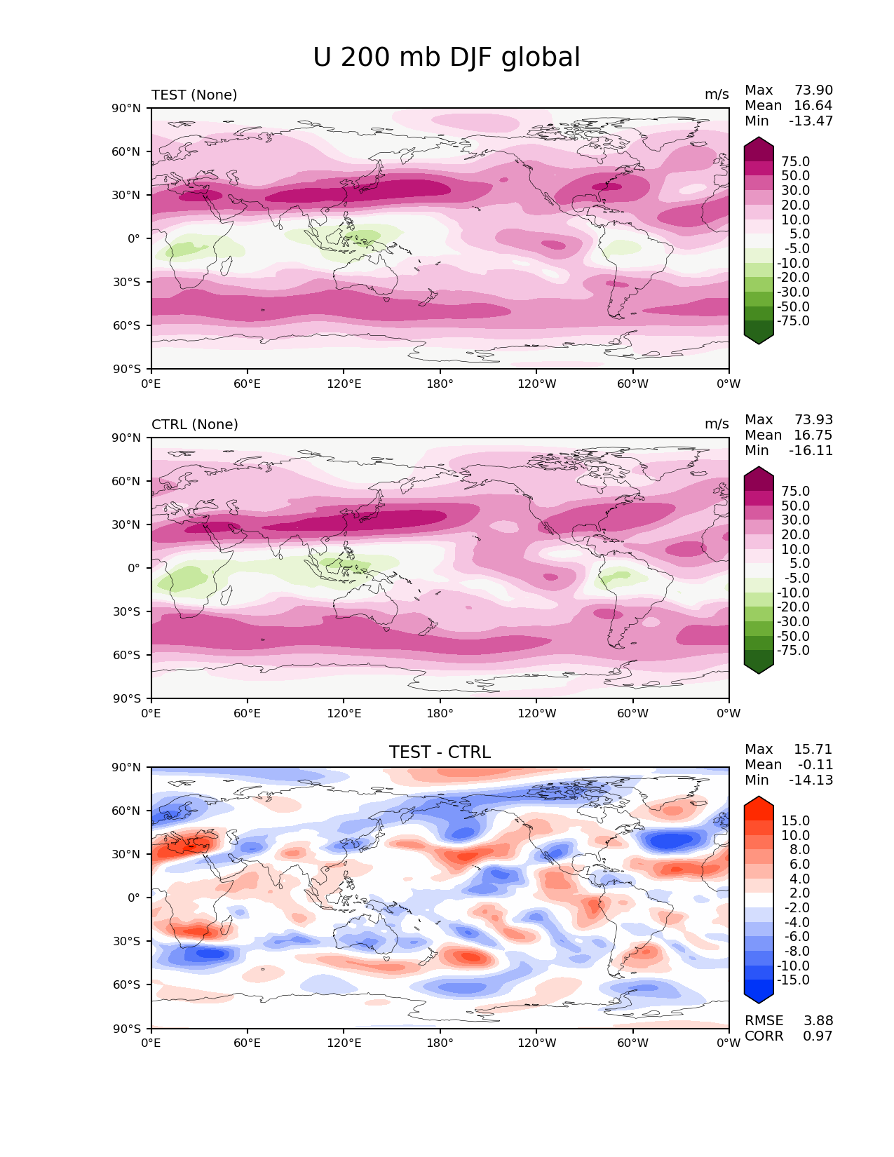 Use this command to recreate this image: | e3sm_diags lat_lon --no_viewer --sets 'lat_lon' --case_id 'MAM4_test_ctrl' --variables 'U' --seasons 'DJF' --plevs '200.0' --test_colormap 'PiYG_r' --reference_colormap 'PiYG_r' --contour_levels '-75' '-50' '-30' '-20' '-10' '-5' '5' '10' '20' '30' '50' '75' --diff_levels '-15' '-10' '-8' '-6' '-4' '-2' '2' '4' '6' '8' '10' '15' --run_type 'model_vs_model' --regions 'global' --regrid_tool 'esmf' --regrid_method 'conservative' --main_title 'U 200 mb DJF global' --backend 'mpl' --output_format 'png' --canvas_size_w '1212' --canvas_size_h '1628' --figsize '8.5' '11.0' --dpi '150' --arrows --test_name 'E3SM_MAM4_test2' --short_test_name 'TEST' --ref_name 'E3SM_MAM4_control' --diff_title 'TEST - CTRL' --diff_colormap 'diverging_bwr.rgb' --multiprocessing --num_workers '32' --granulate 'variables' 'seasons' 'plevs' 'regions' --selectors 'sets' 'seasons' --reference_data_path '/global/cscratch1/sd/gxlin/MMF_regrid_data/E3SM_MAM4_control/climo_outdir/' --results_dir '/global/project/projectdirs/e3sm/www/gxlin/' --test_data_path '/global/cscratch1/sd/gxlin/MMF_regrid_data/E3SM_MAM4_test/climo_outdir/' |