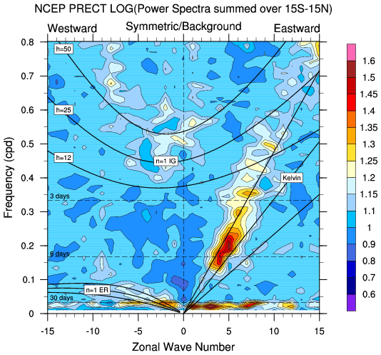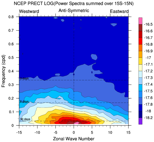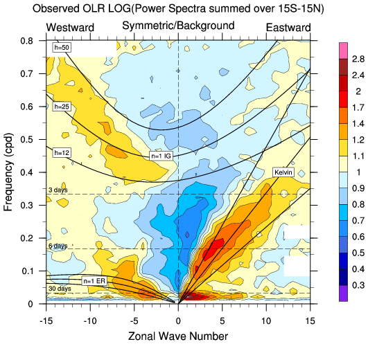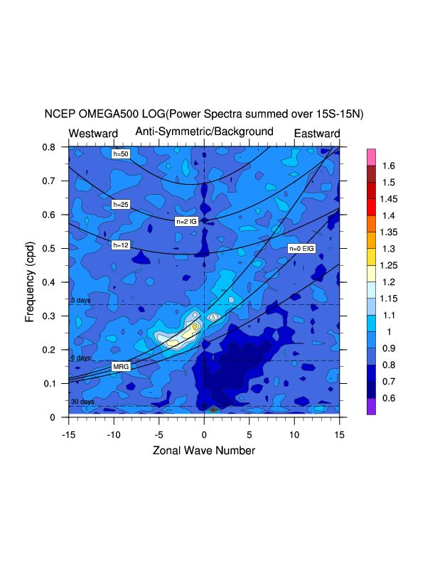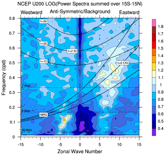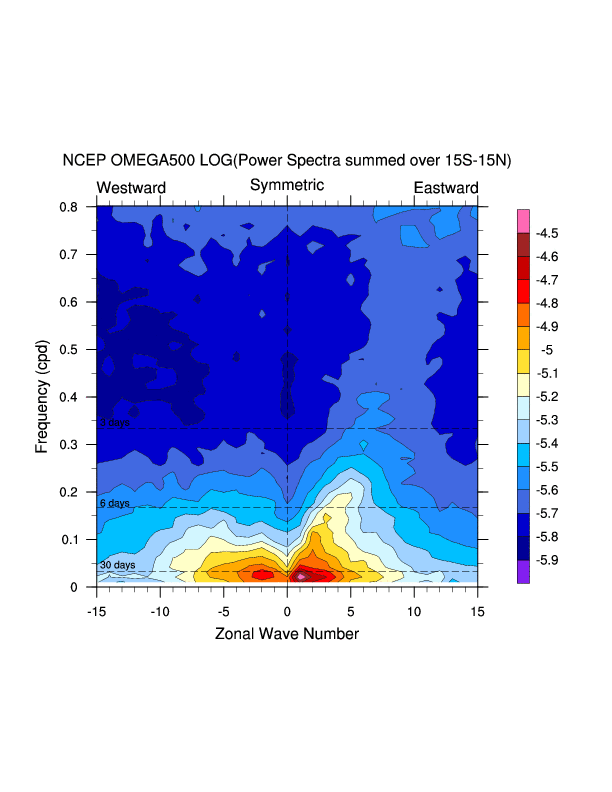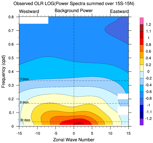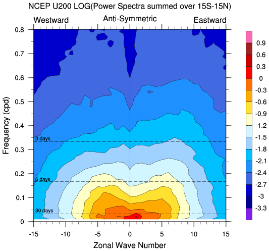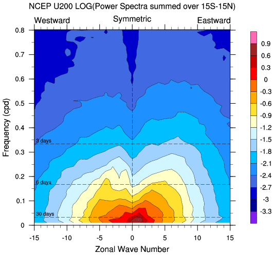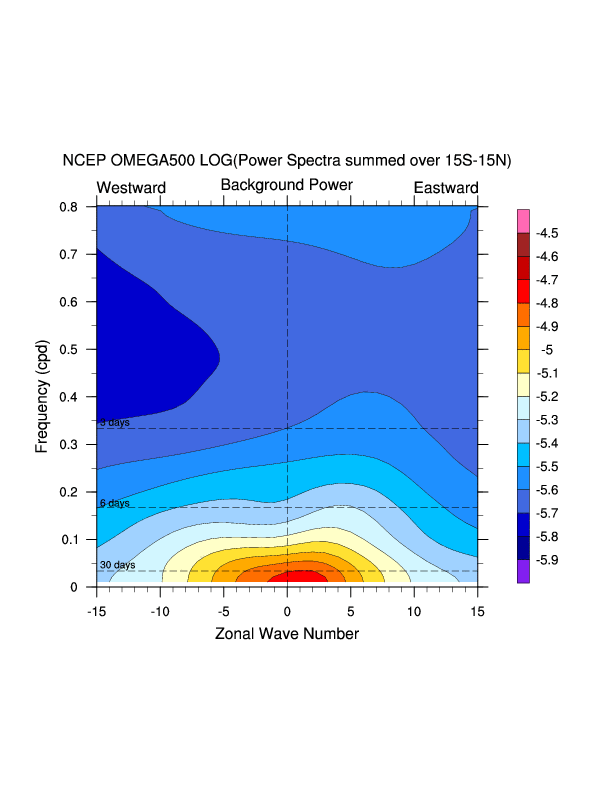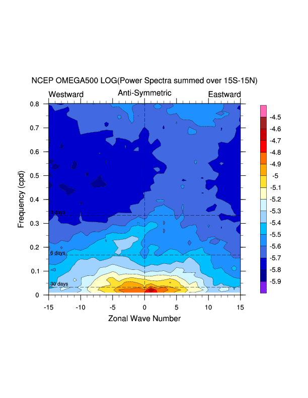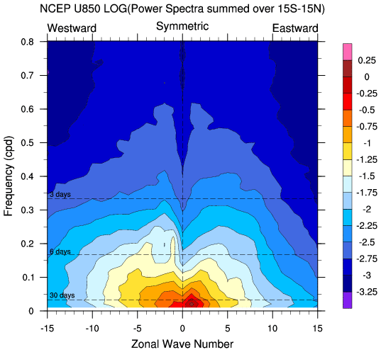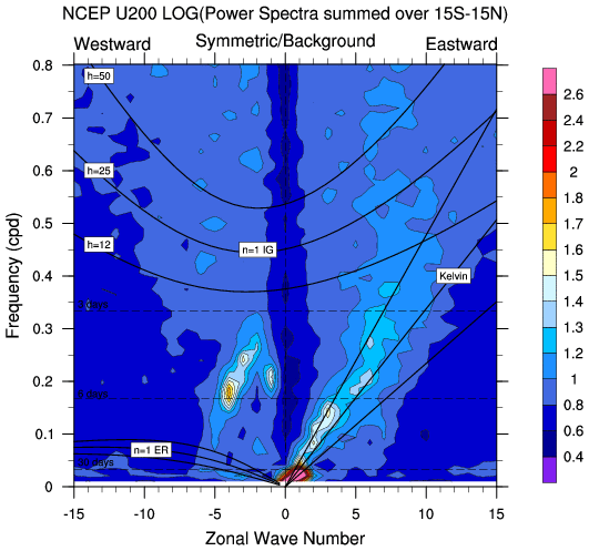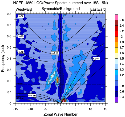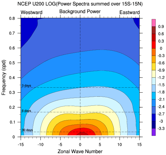 Zonal wavenumber-frequency logarithm of power spectra calculated from 06Z and