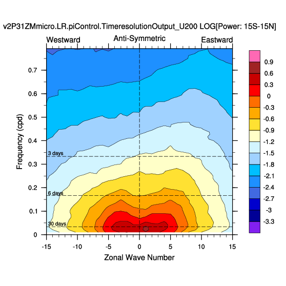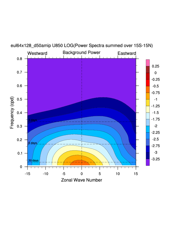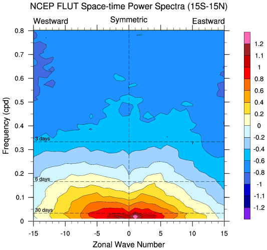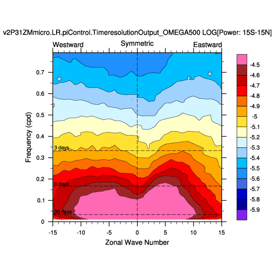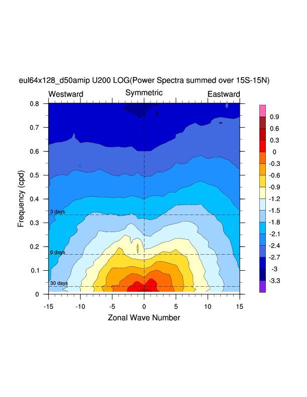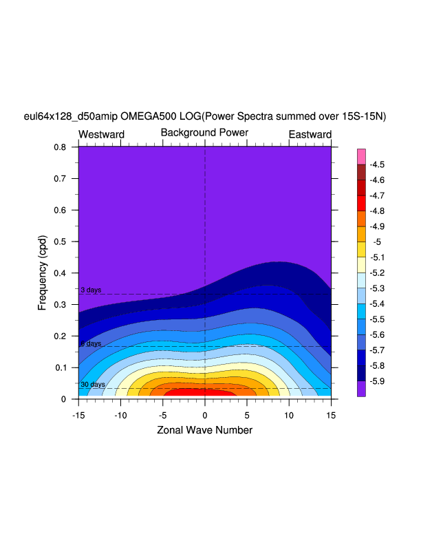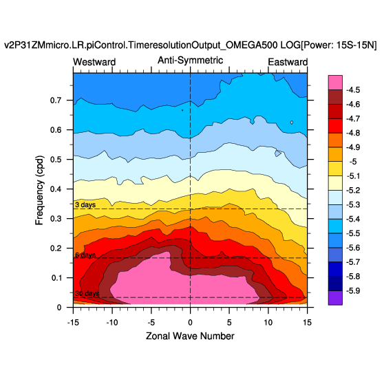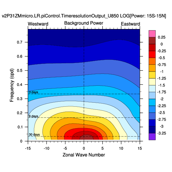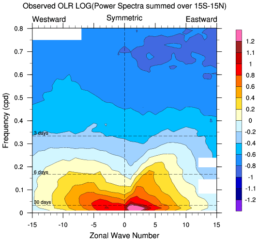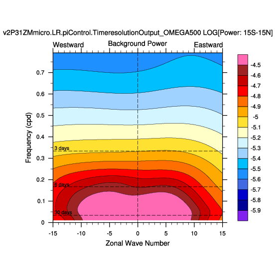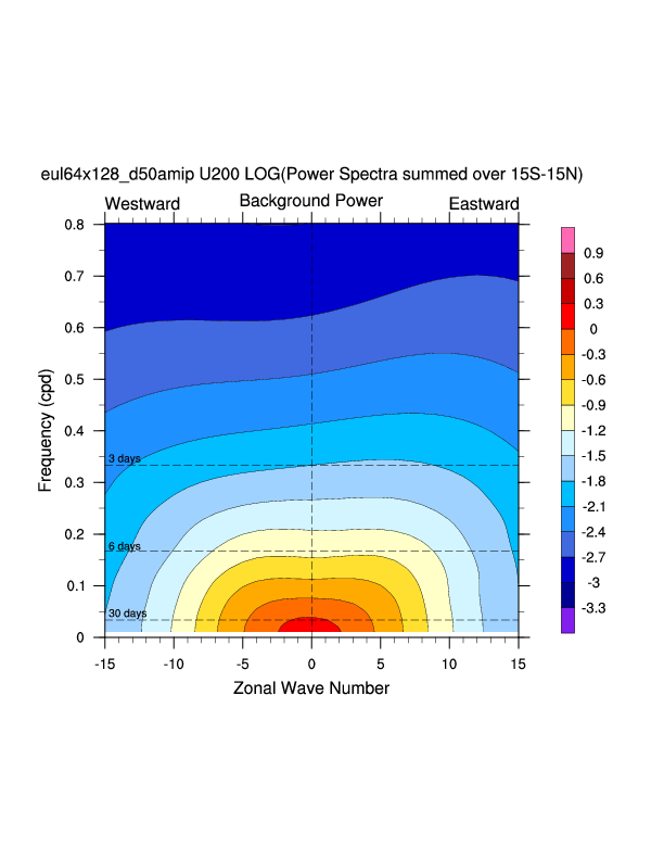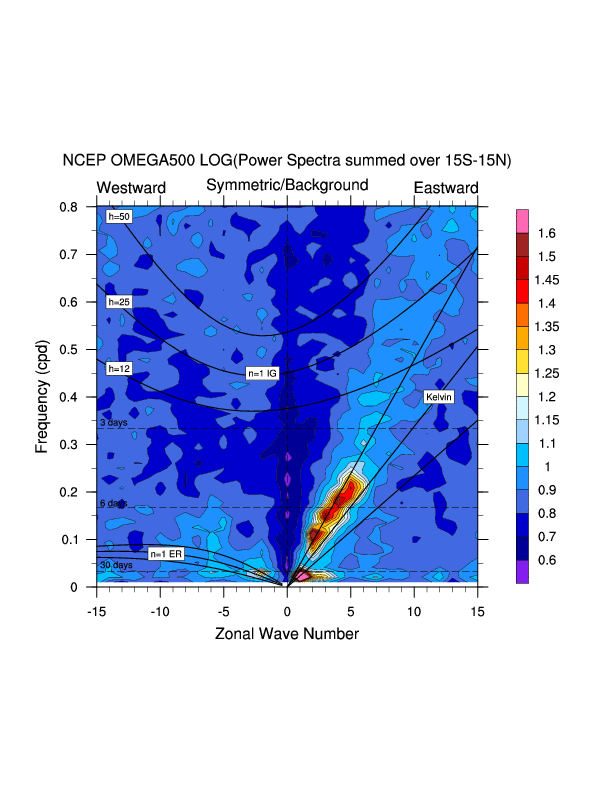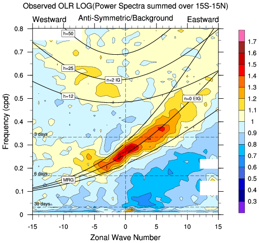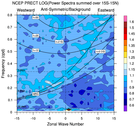 Zonal wavenumber-frequency logarithm of power spectra calculated from 06Z and